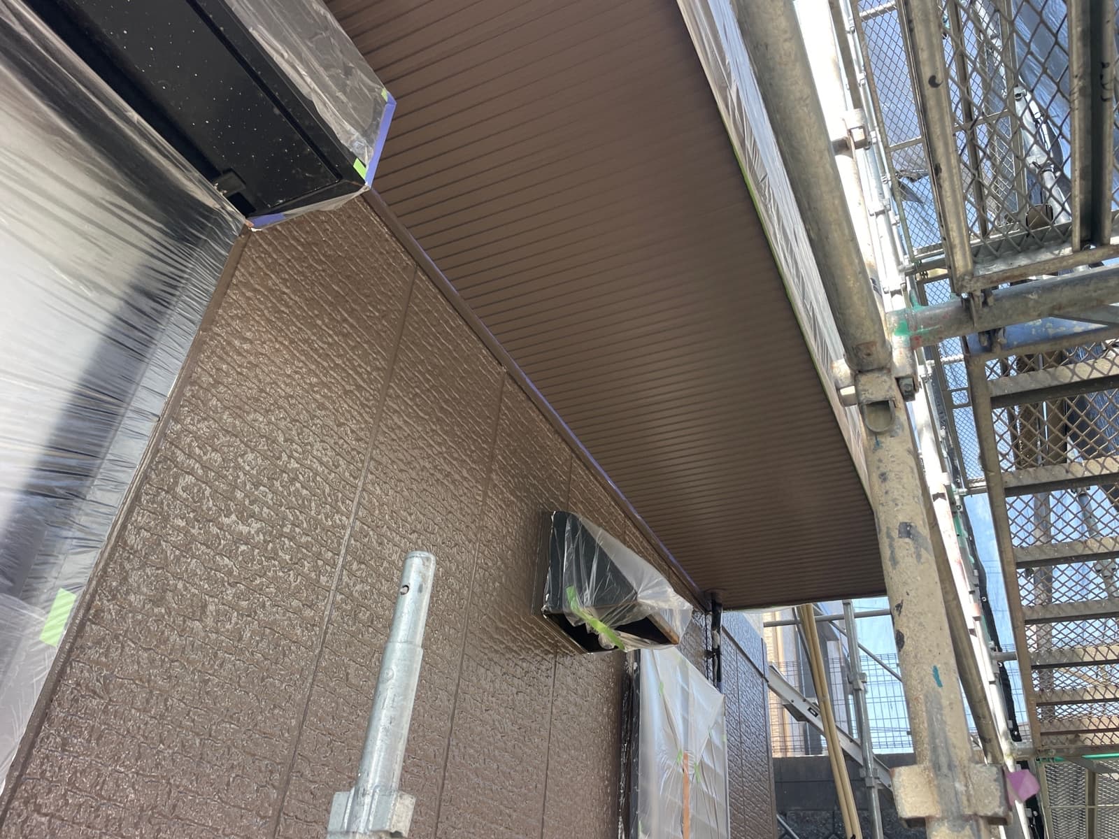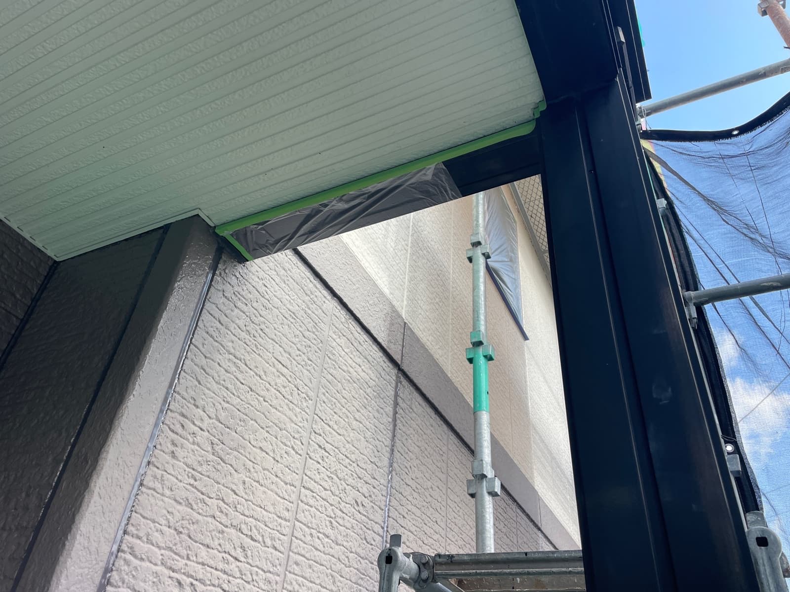 本日は外壁下塗り1回目、鉄部錆止め、軒天塗装をさせて頂いております。