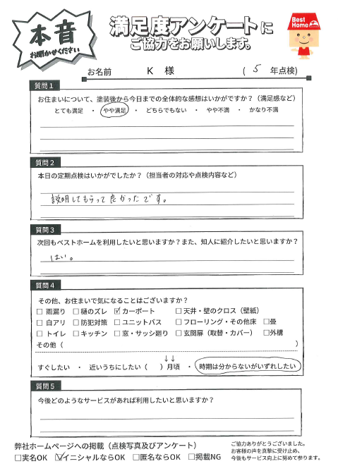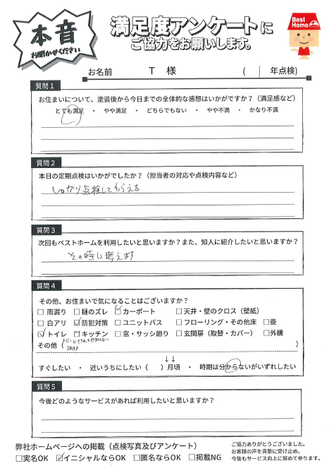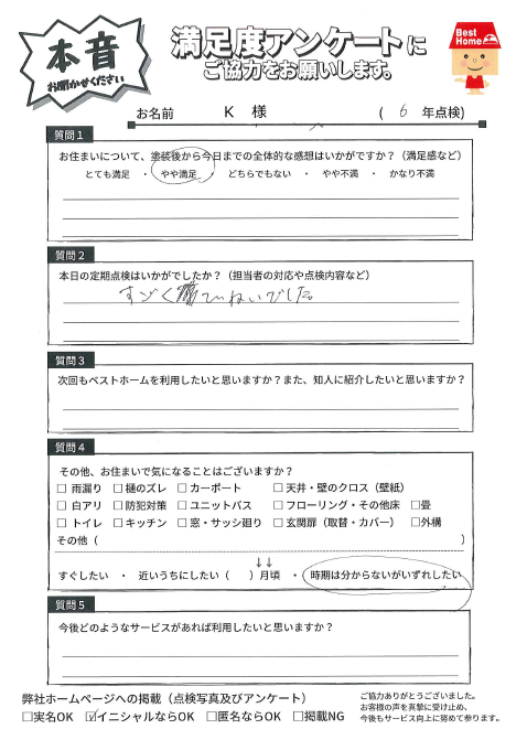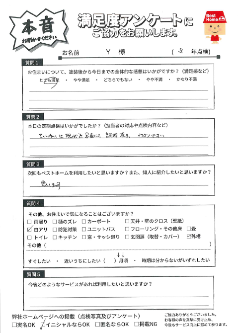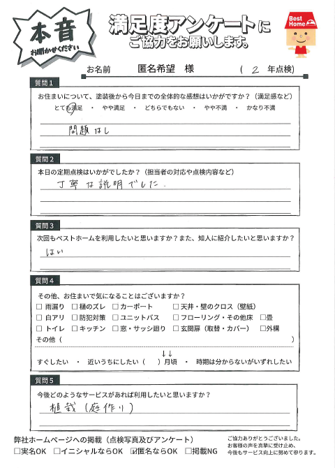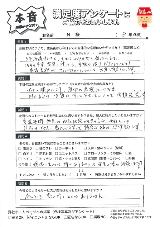 3年経過する中で、大きなマイナスを感じることもなく、こちらの希望・要望に対しても可能な限り対応してくださり、塗装実施からアフターフォローについては大方満足しています。