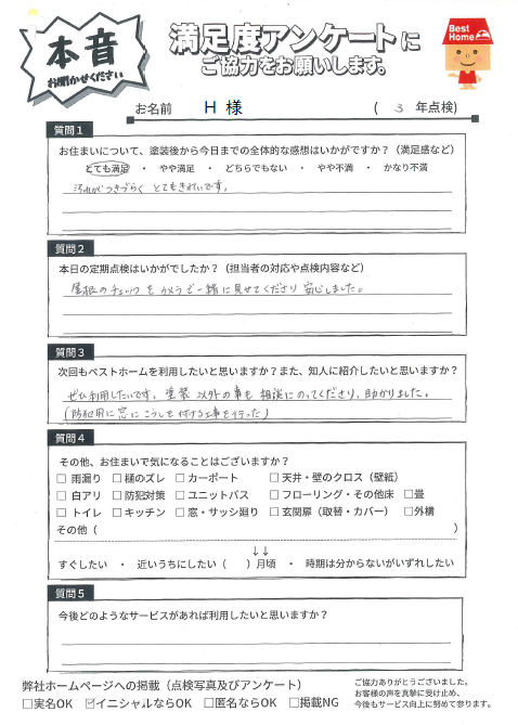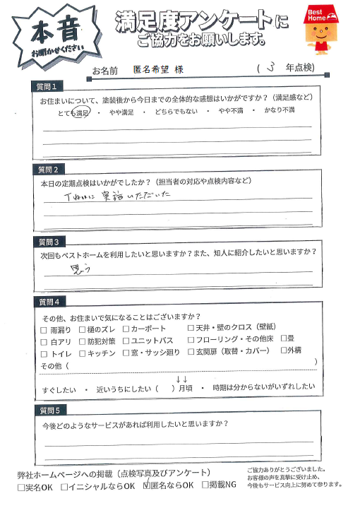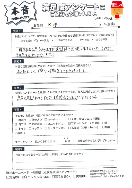 ご協力ありがとうございました!お客様の業者とのやり取りで負担を減らすために、リフォーム全般も承っております。何かご要望がありましたら、いつでもお気軽にご相談ください。来年の2年点検も伺いますので、今後ともよろしくお願いいたします!