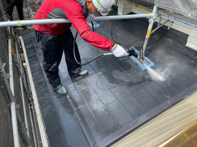 屋根材を割らないよう、部位ごとに水圧を変えながら洗浄します。
