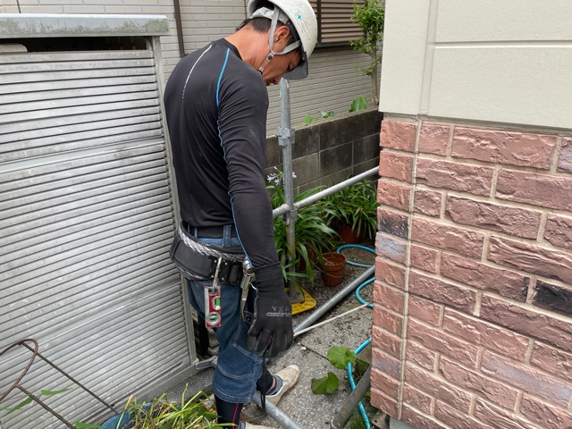 足場材が外壁にあたってしまわないよう、細心の注意を払っております。