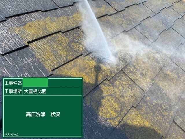 劣化が進んだ屋根材は割れやすくなっています。屋根材を割らないよう、部位ごとに水圧を変えながら洗浄します。