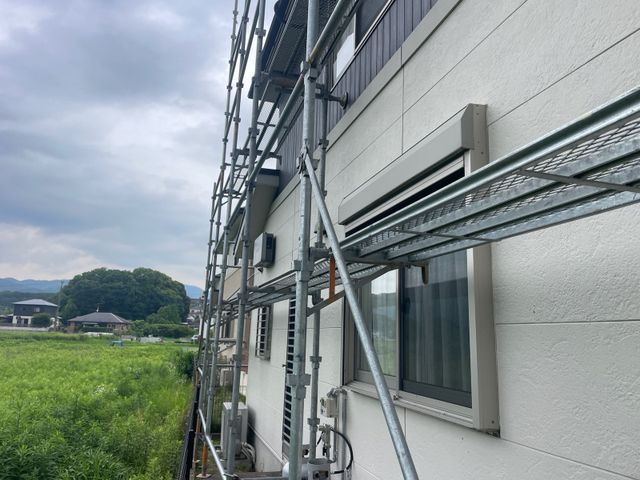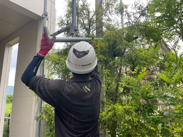 足場材が外壁にあたってしまわないよう、細心の注意を払っております。