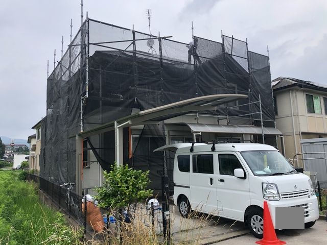 塗装工事の際、塗料が飛び散らないようにメッシュシートで覆わせていただきます。