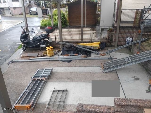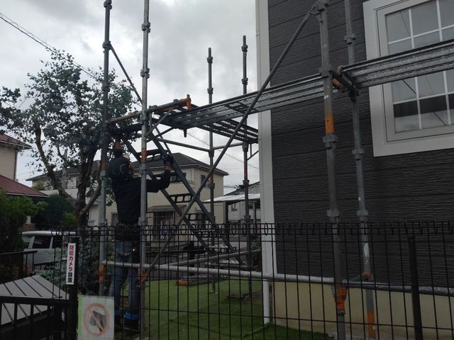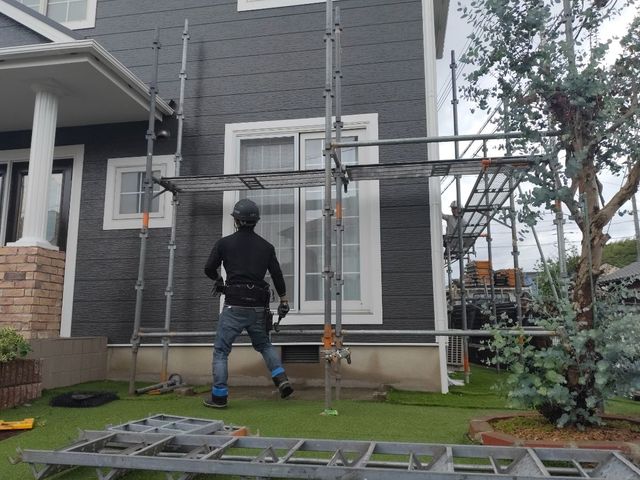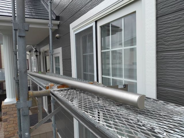 足場材が外壁にあたってしまわないよう、細心の注意を払っております。
