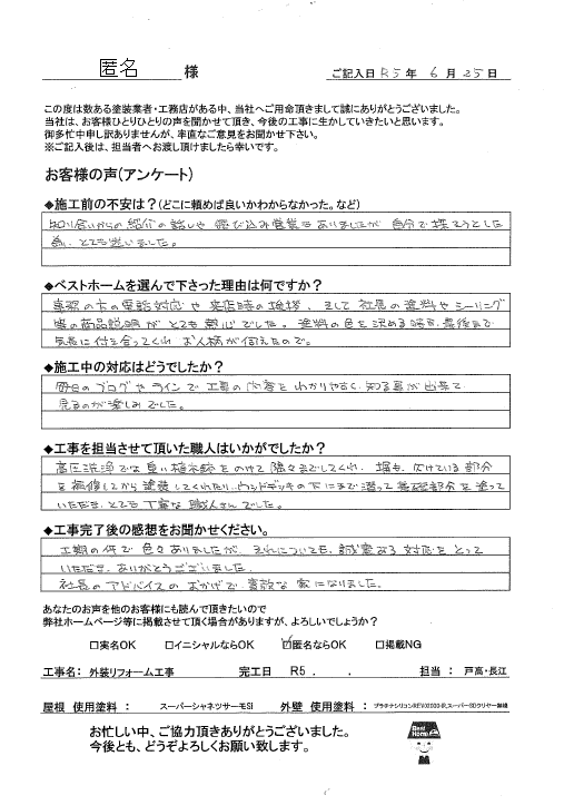 塗料の色を決める時も、最後まで気長に付き合ってくれお人柄が伺えたので。