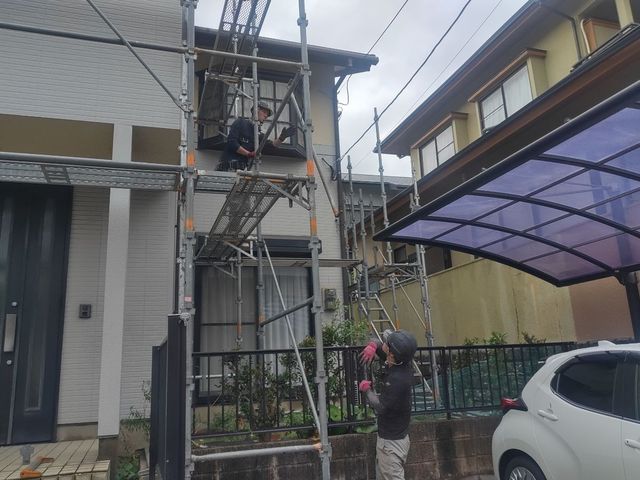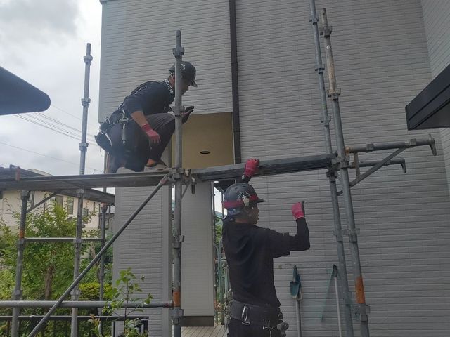 足場材が外壁にあたってしまわないよう、細心の注意を払っております。