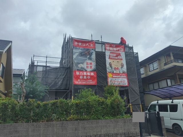 塗装工事の際、塗料が飛び散らないようにメッシュシートで覆わせていただきます。