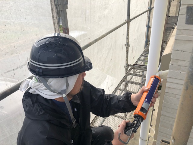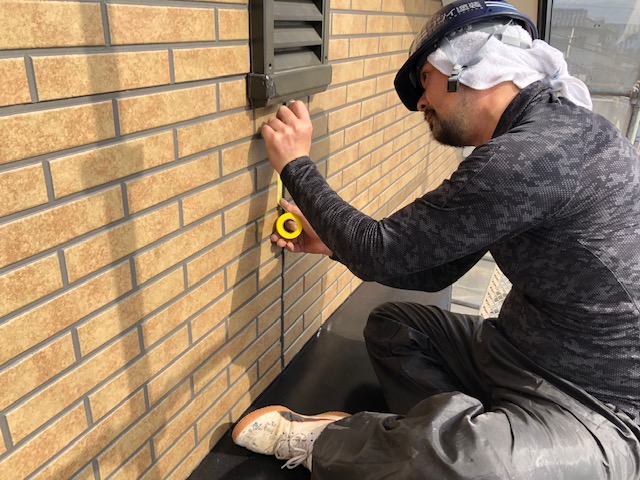 養生は現場の顔です。塗料を飛散させないことはもちろんですが、特にサッシ廻り等は養生を真っ直ぐにしていないと仕上がりの見栄えが悪くなるため、丁寧な作業を心がけています。