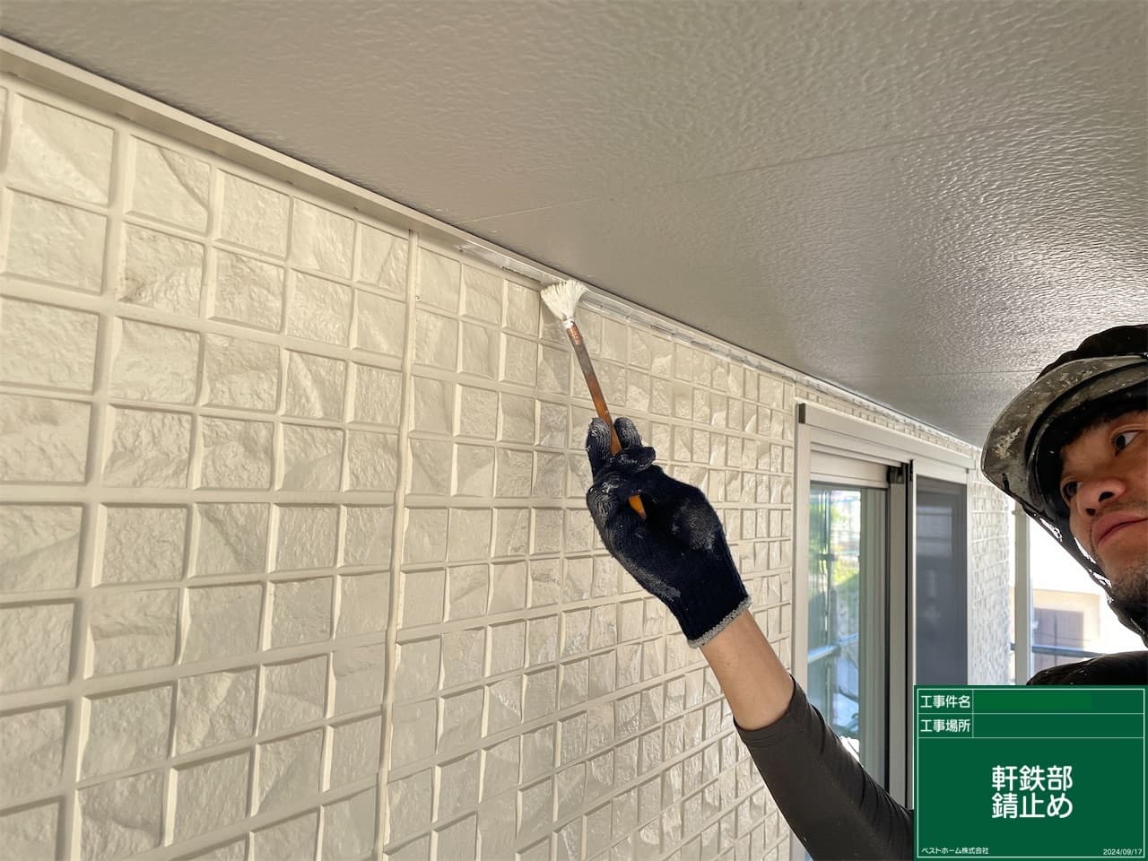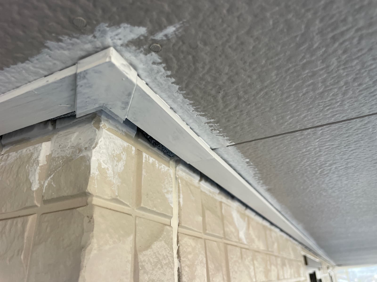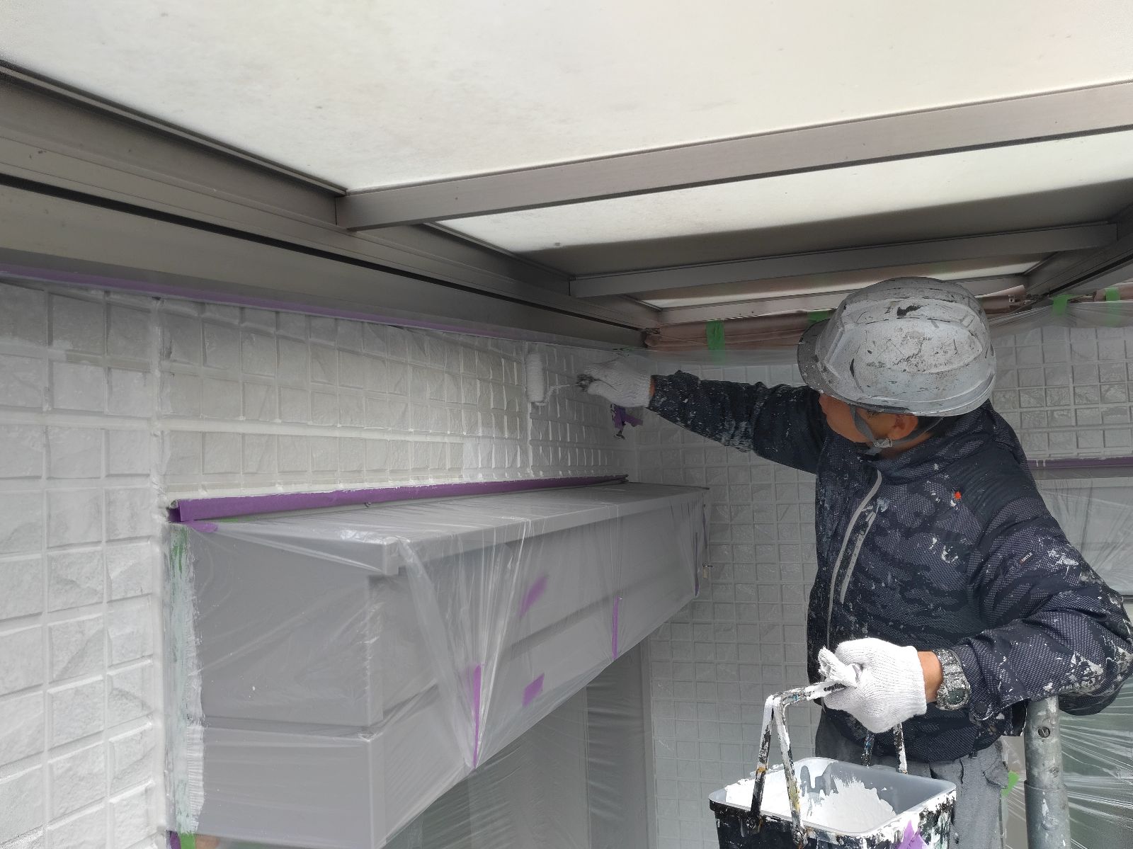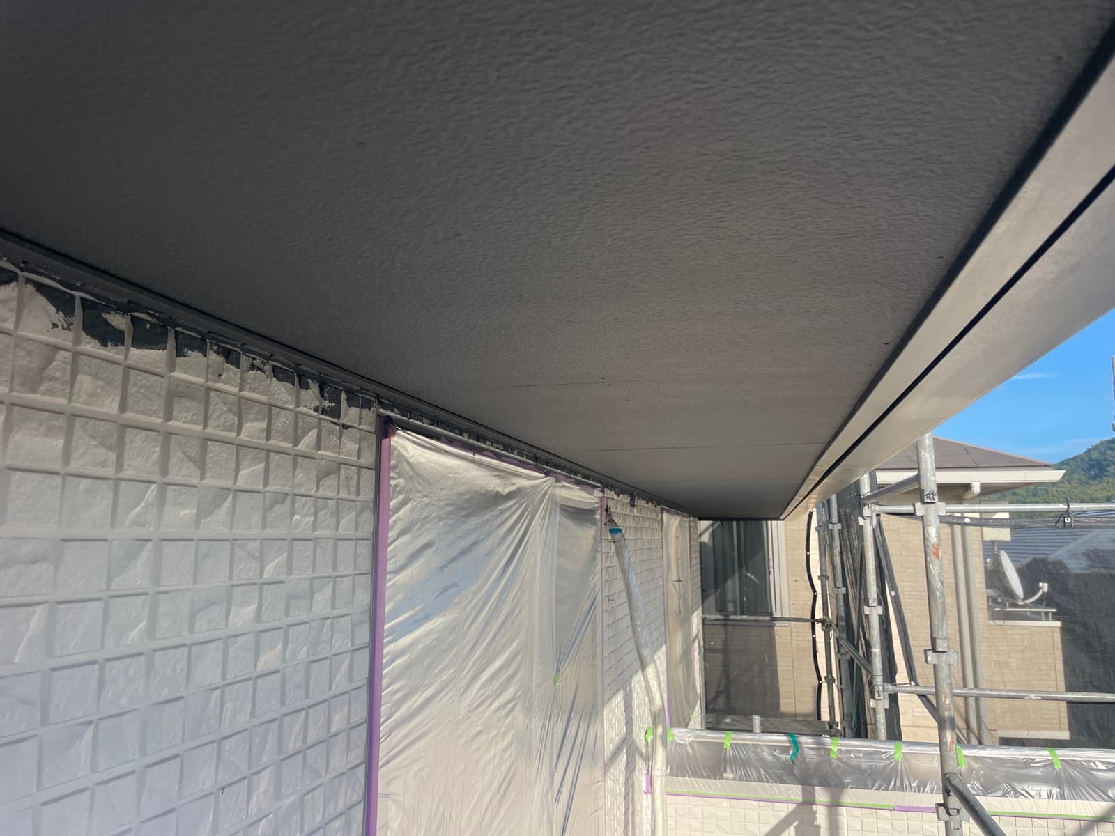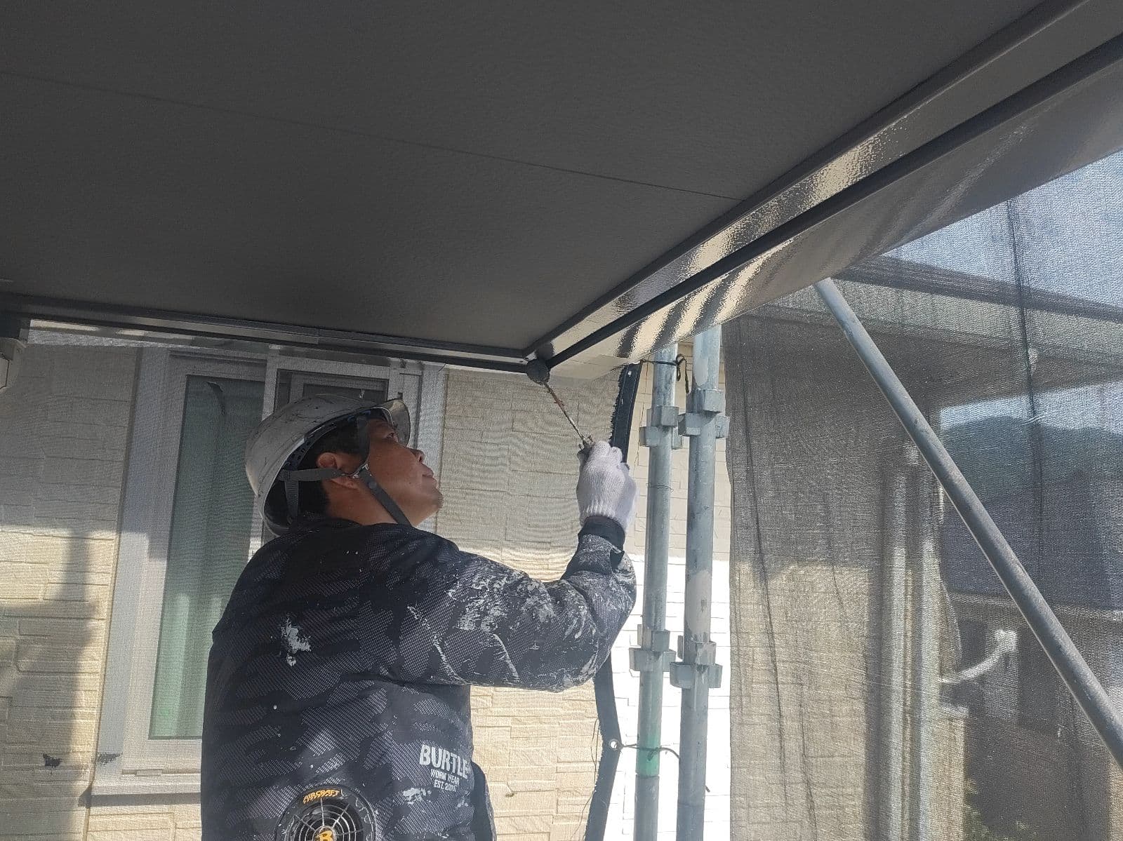 本日は軒天や樋などの付帯部の塗装をおこなっております!