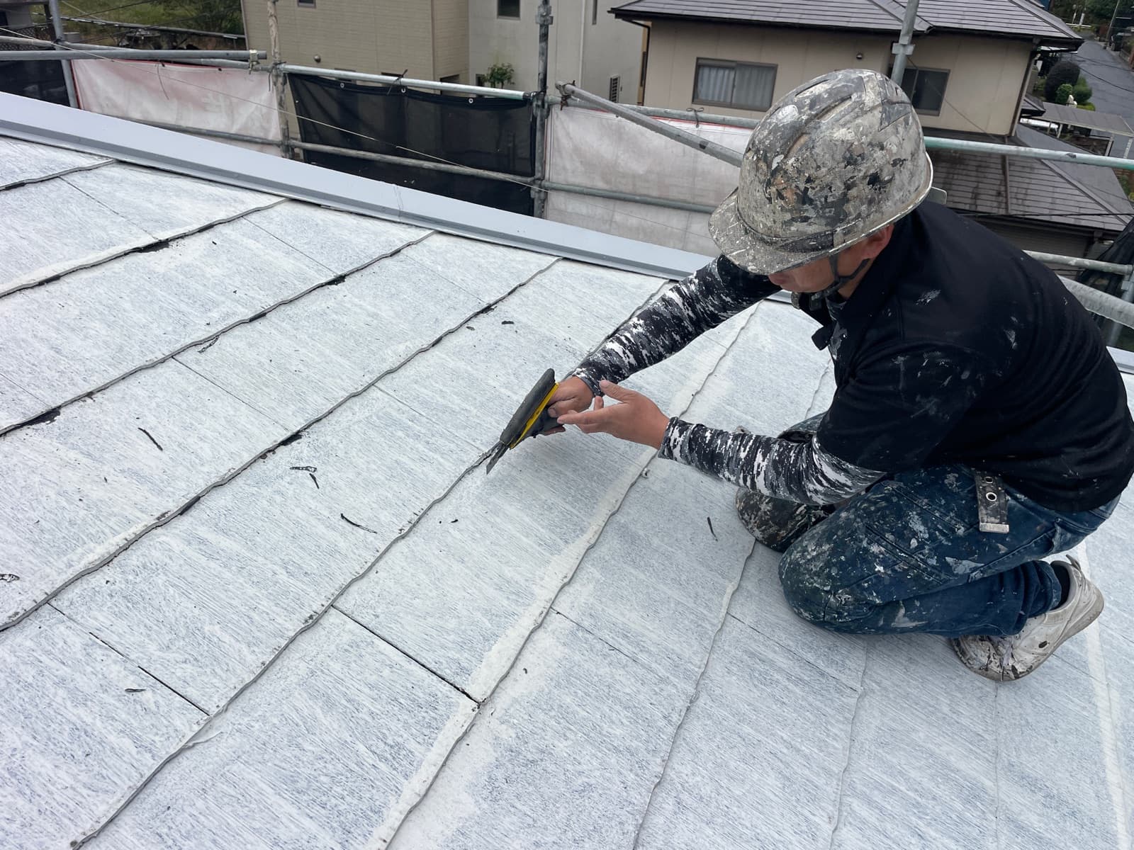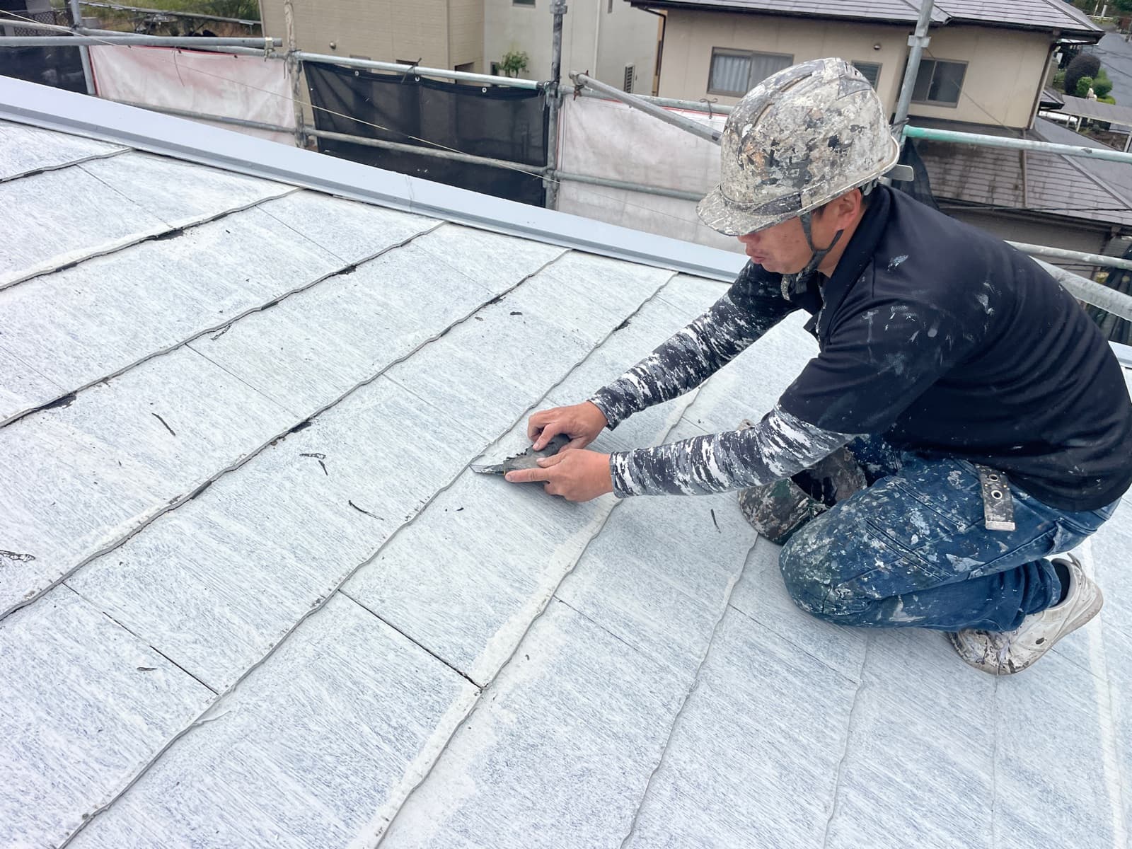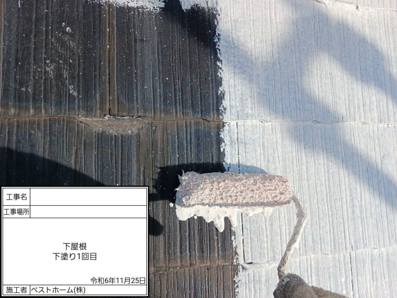 屋根は下塗り1回目をおこない、下塗り材の白色で綺麗に染まっております!
