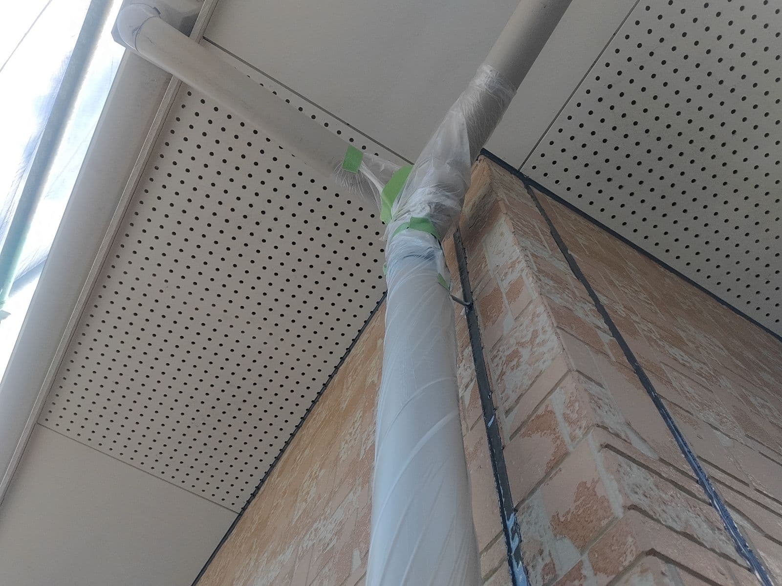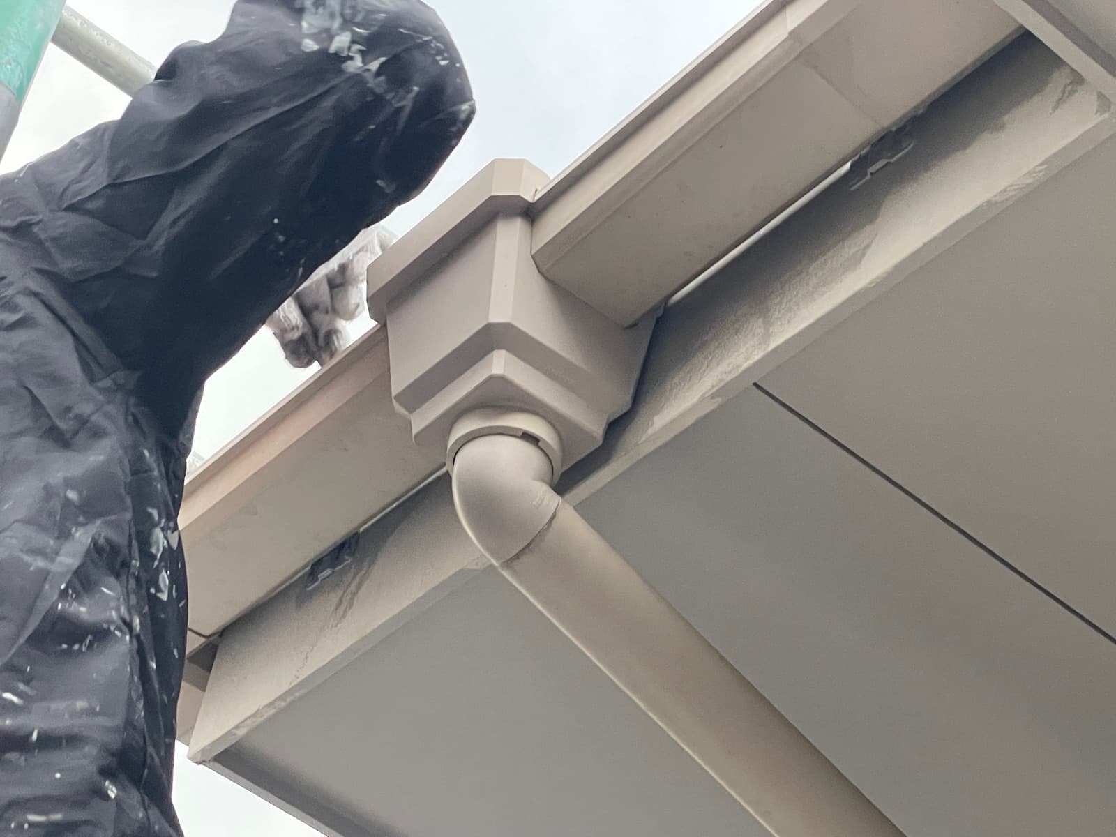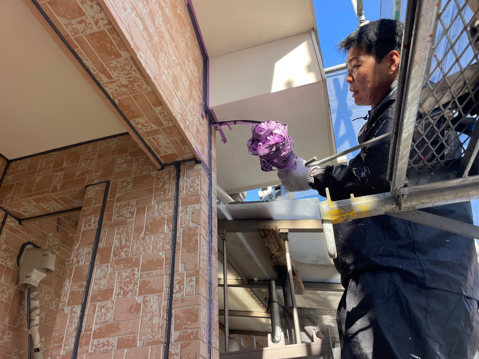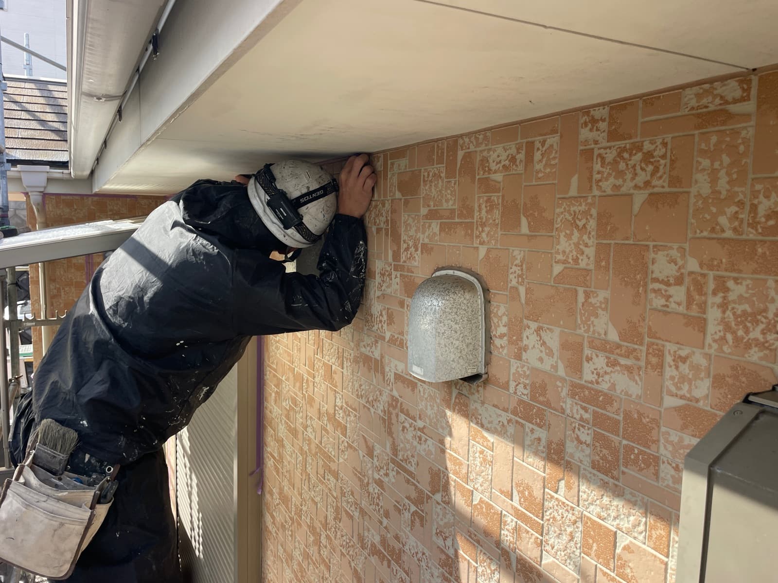 本日は軒天塗装、外壁下塗り1回目、付帯部塗装をおこなっております!