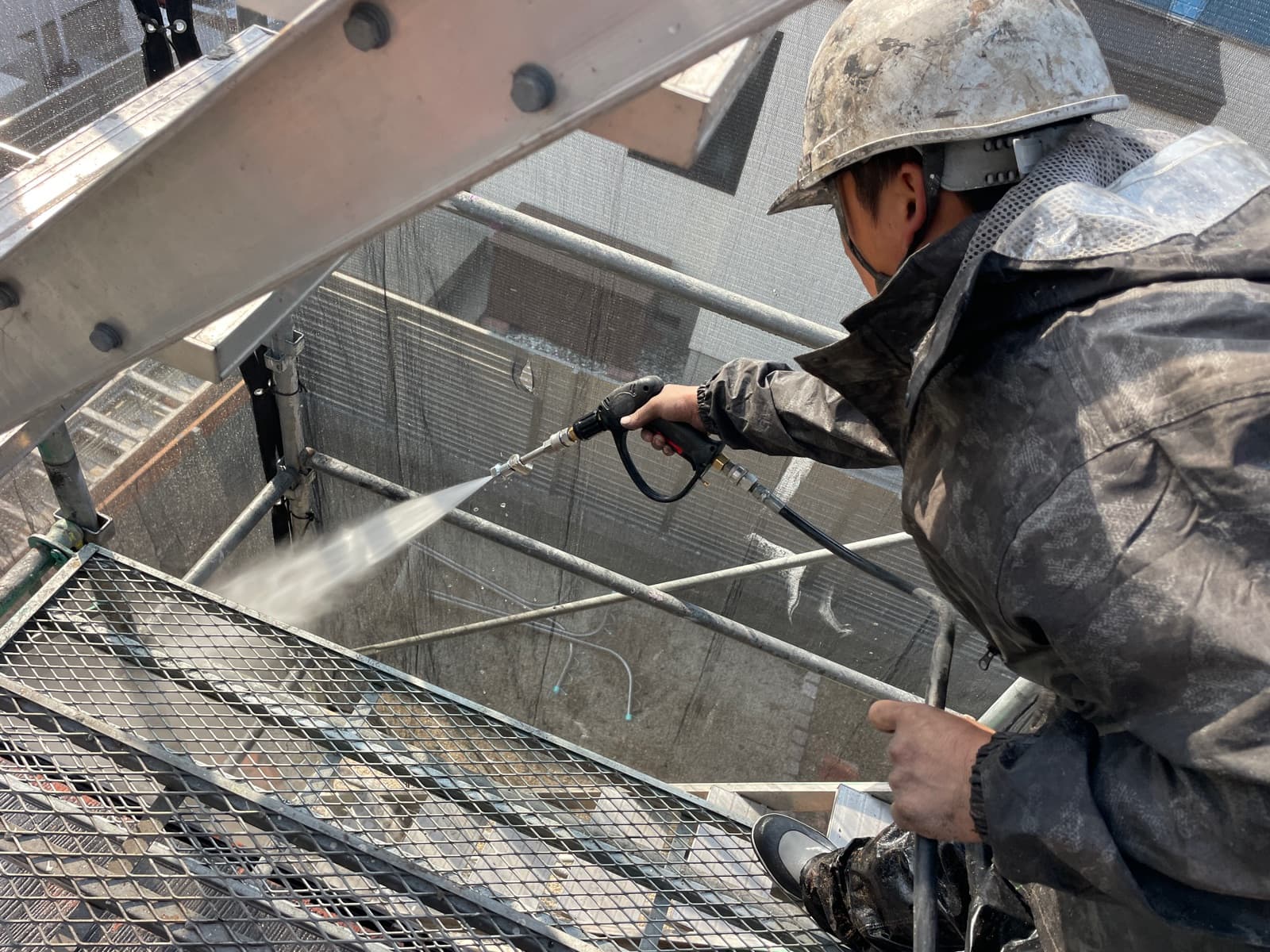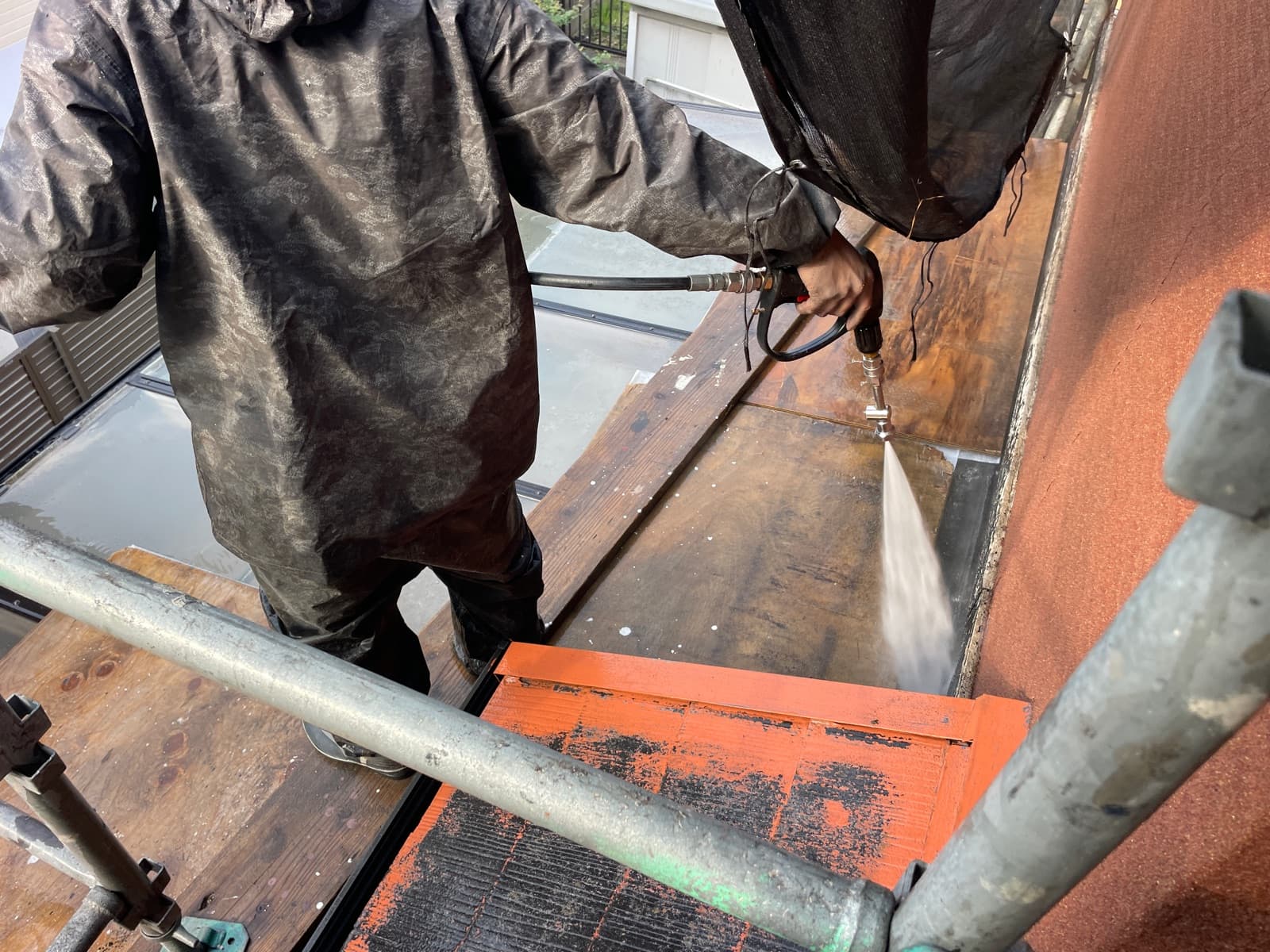 高圧洗浄でしっかりと汚れや旧塗膜を落とし