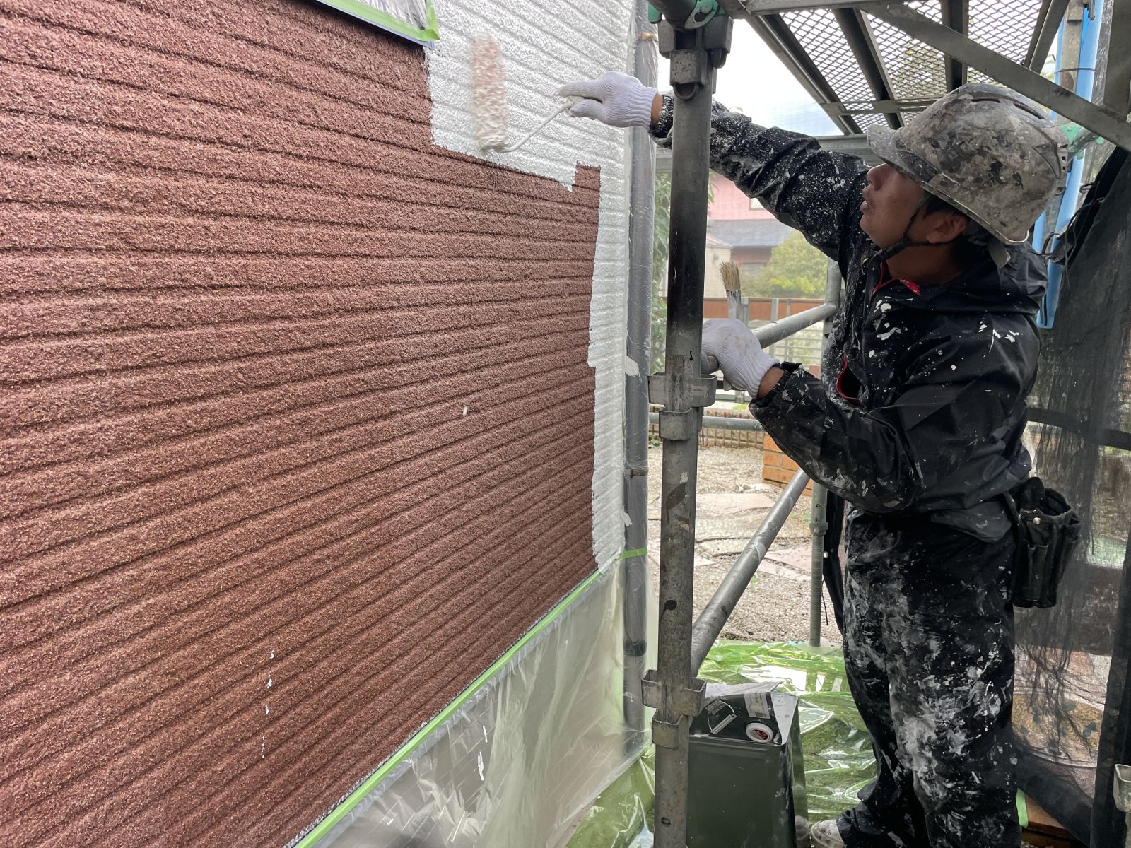 本日は外壁上塗り1回目、屋根下塗り1回目をさせて頂いております!