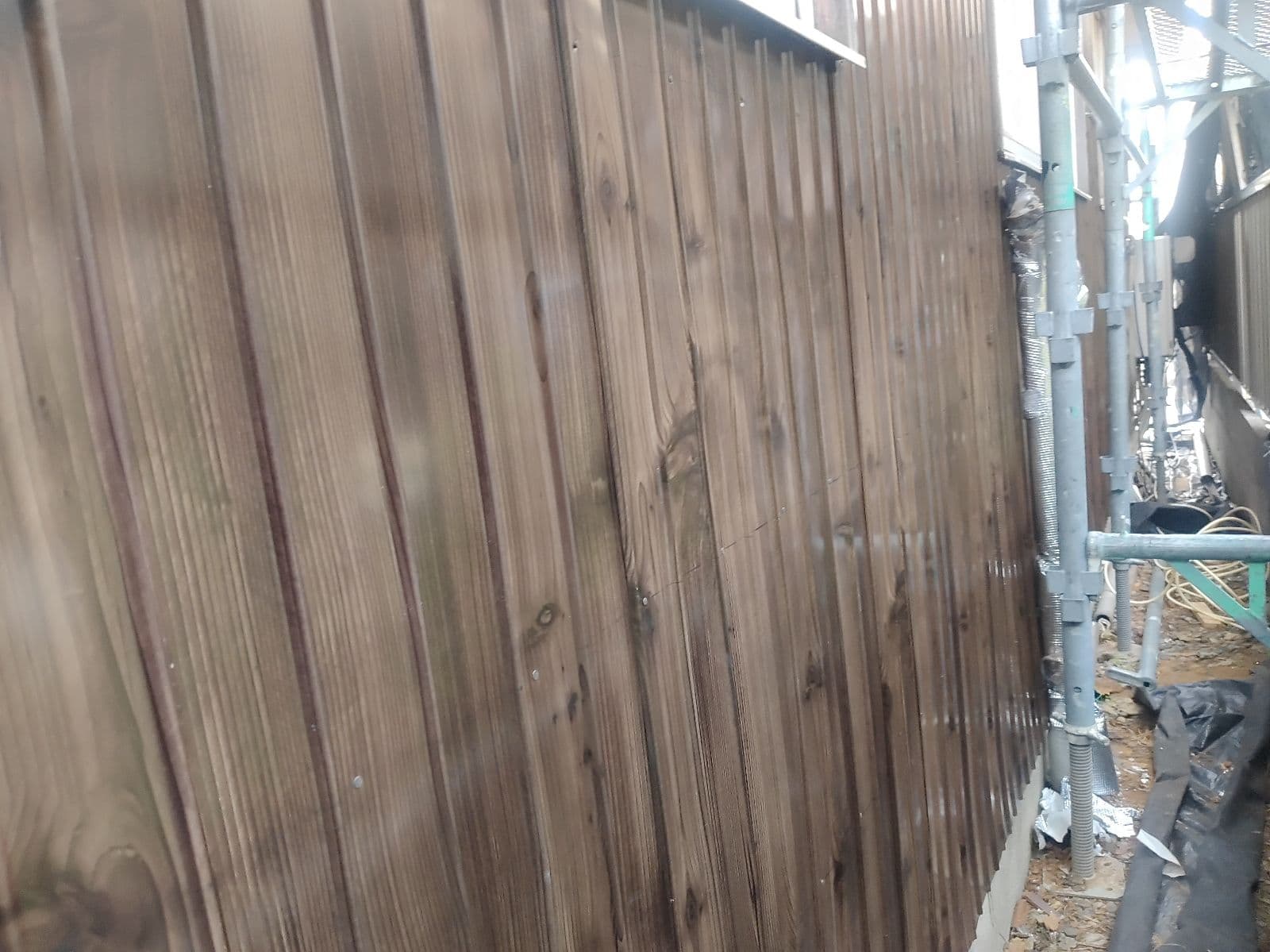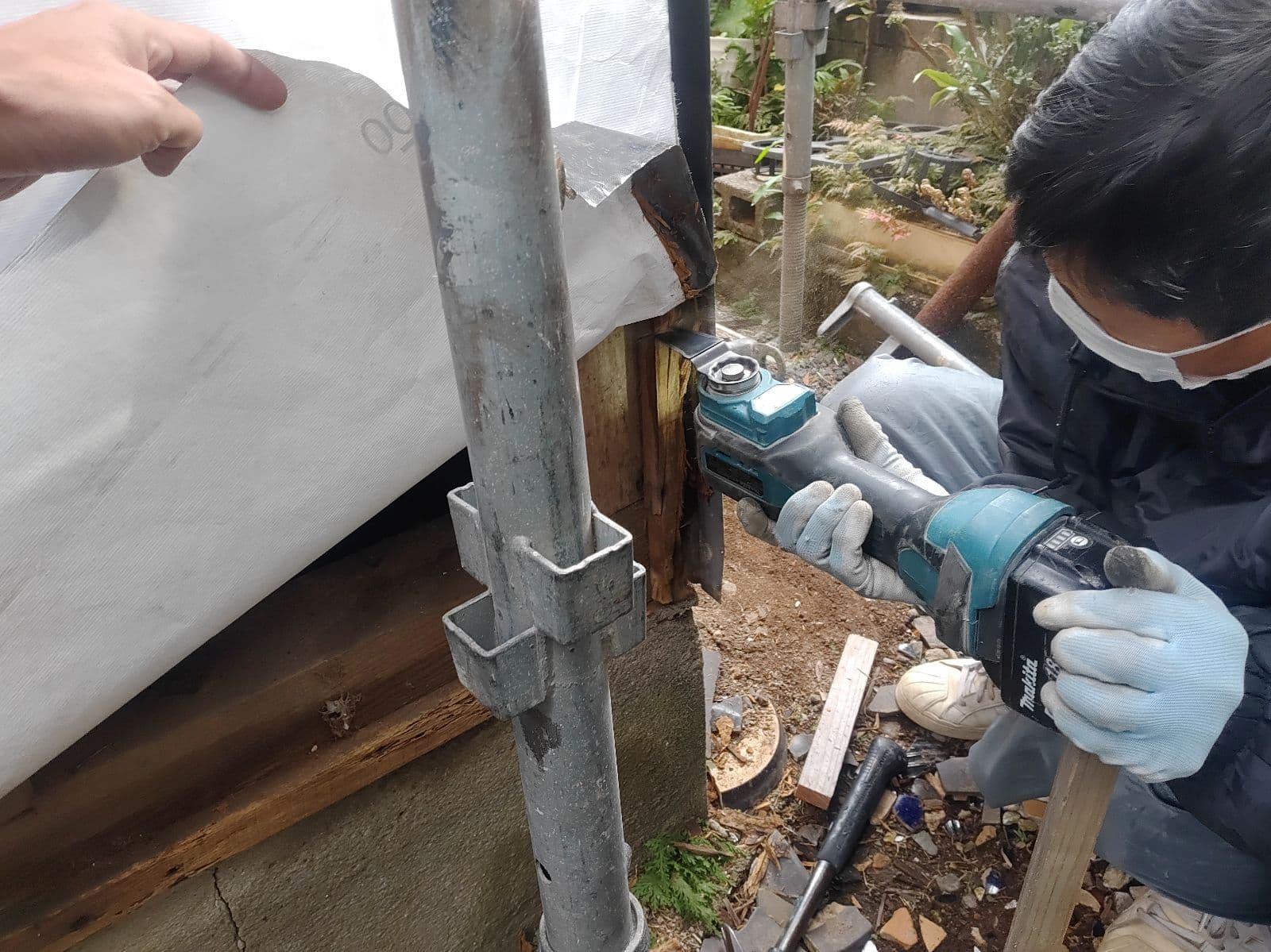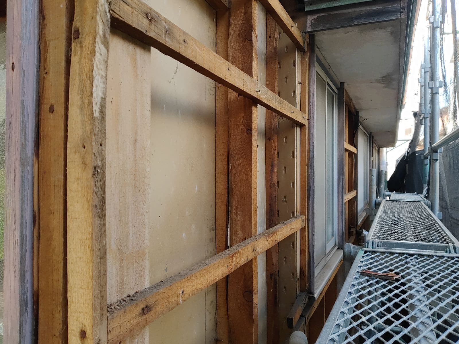 本日は外壁取り外し、防水シート張りなどをさせて頂いております。