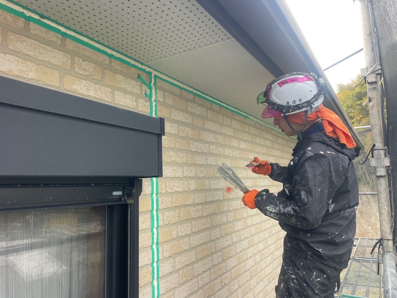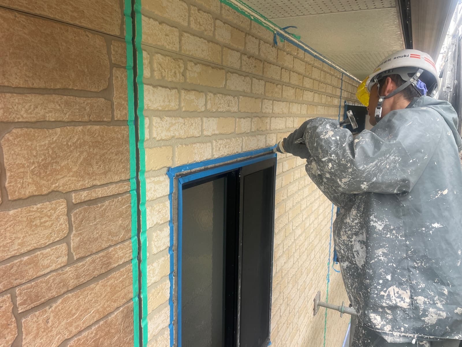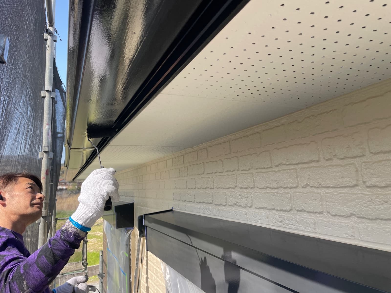 本日は外壁上塗り2回目、付帯部塗装をさせて頂いております。