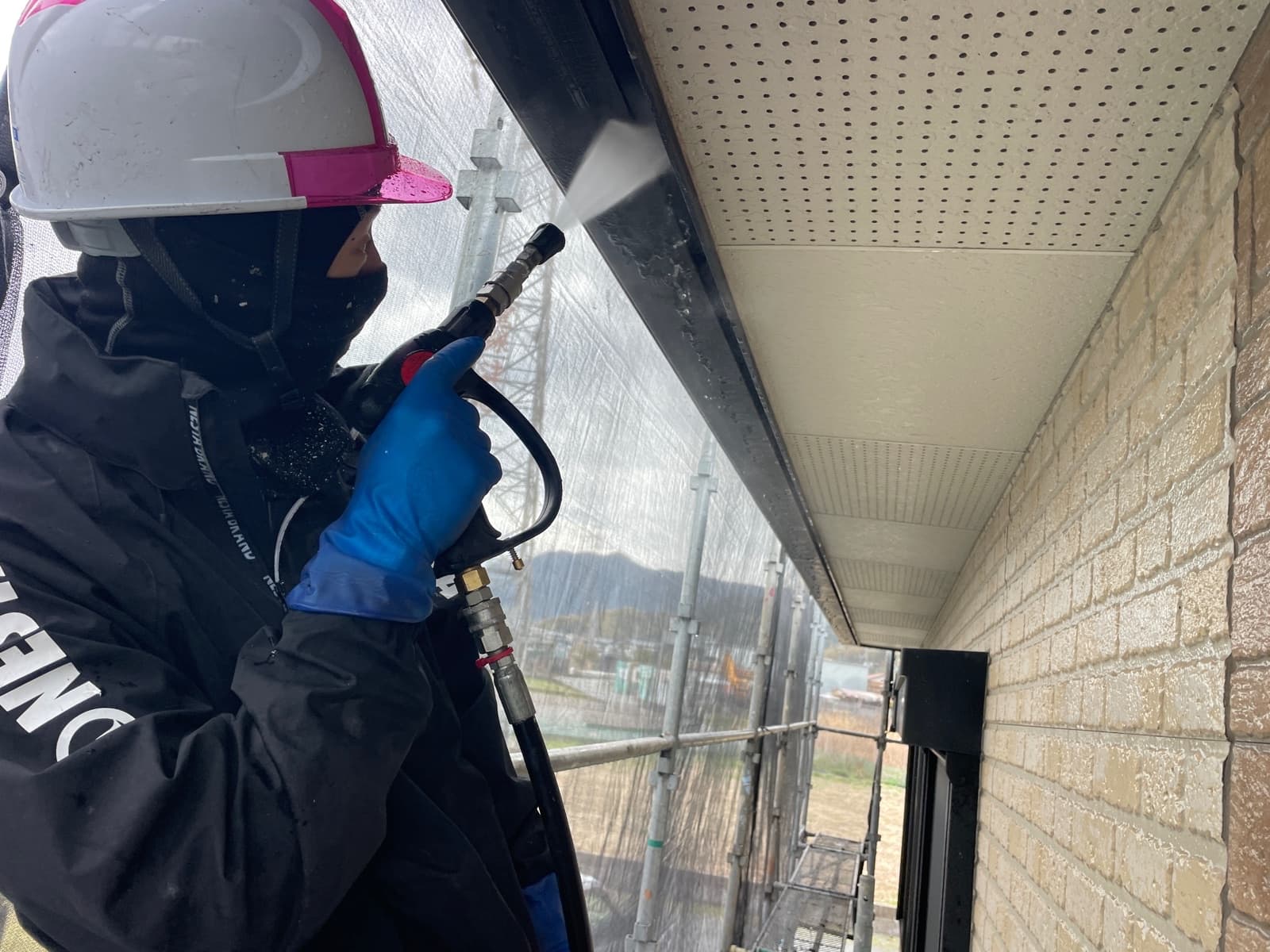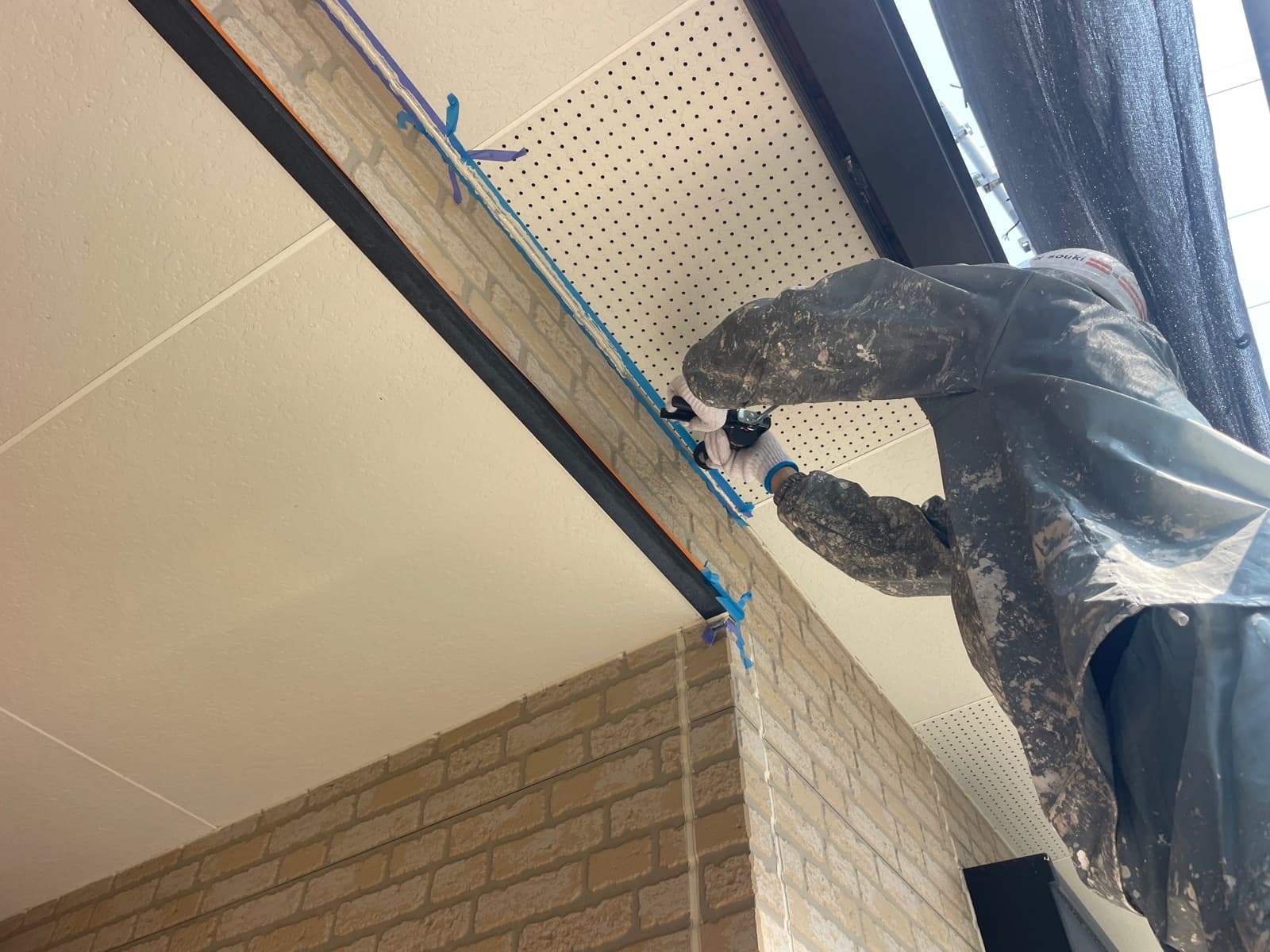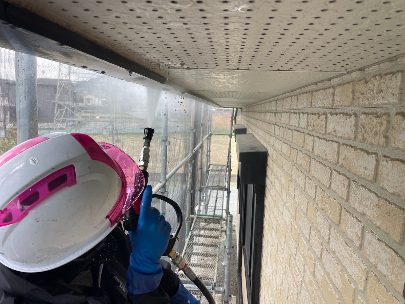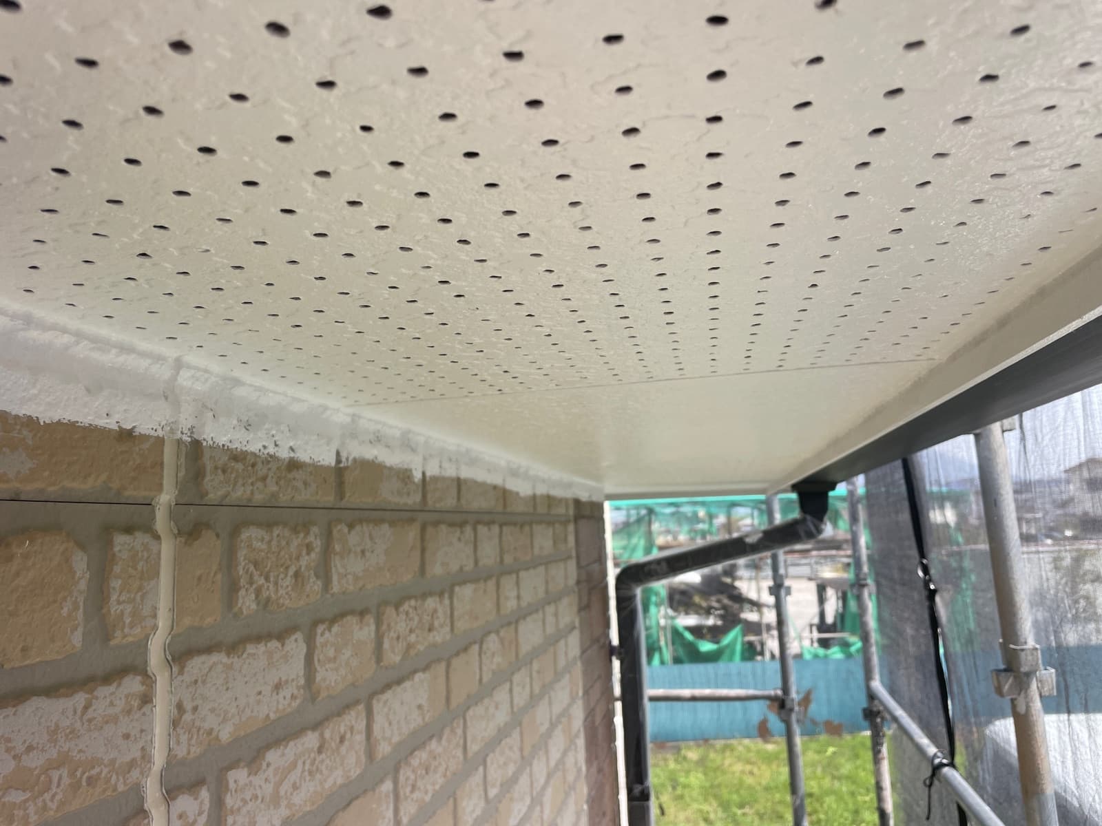 本日は軒天塗装、外壁下塗り1回目(途中)をさせて頂いております。
