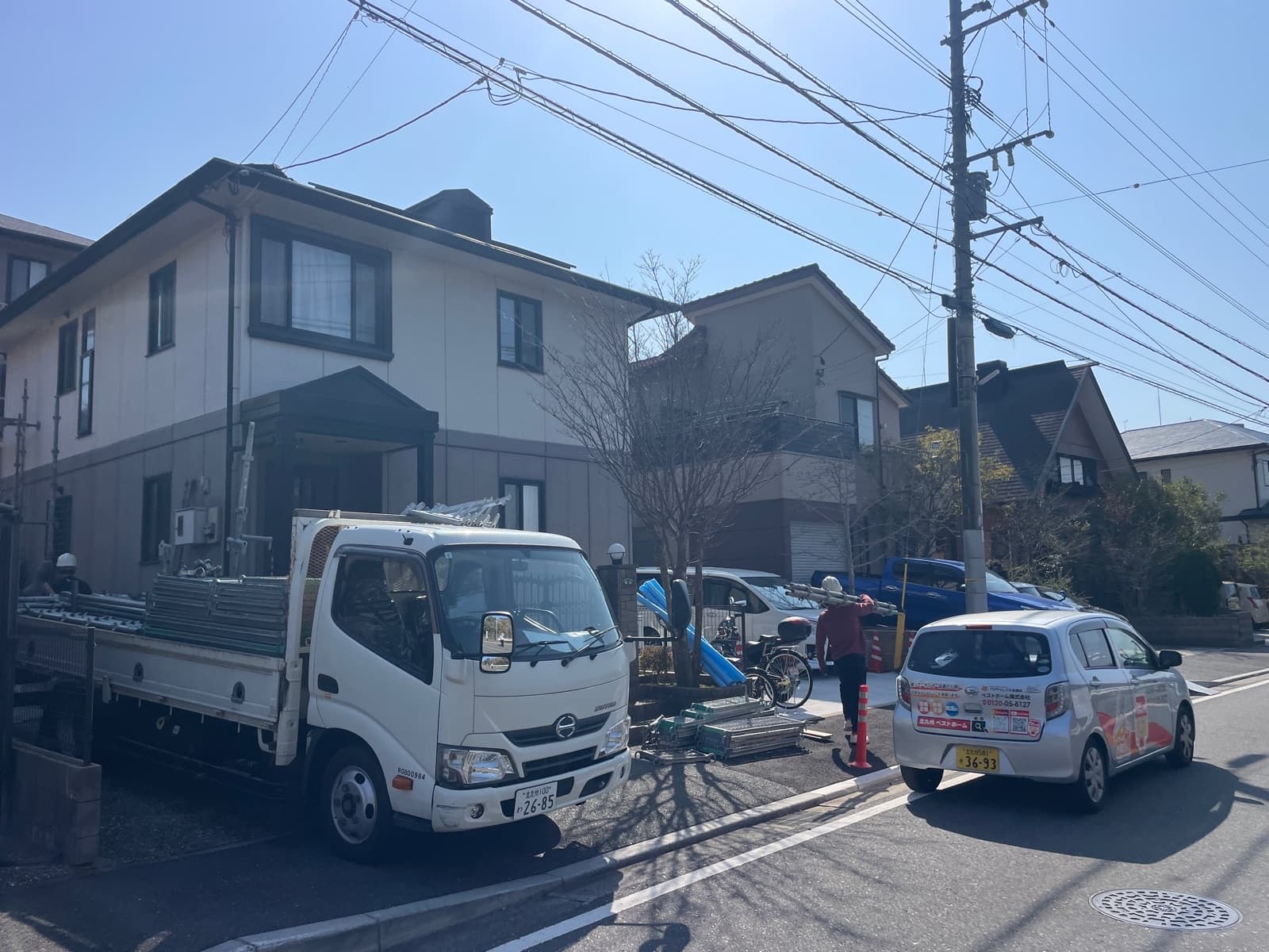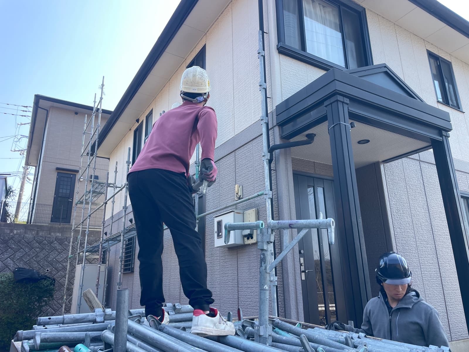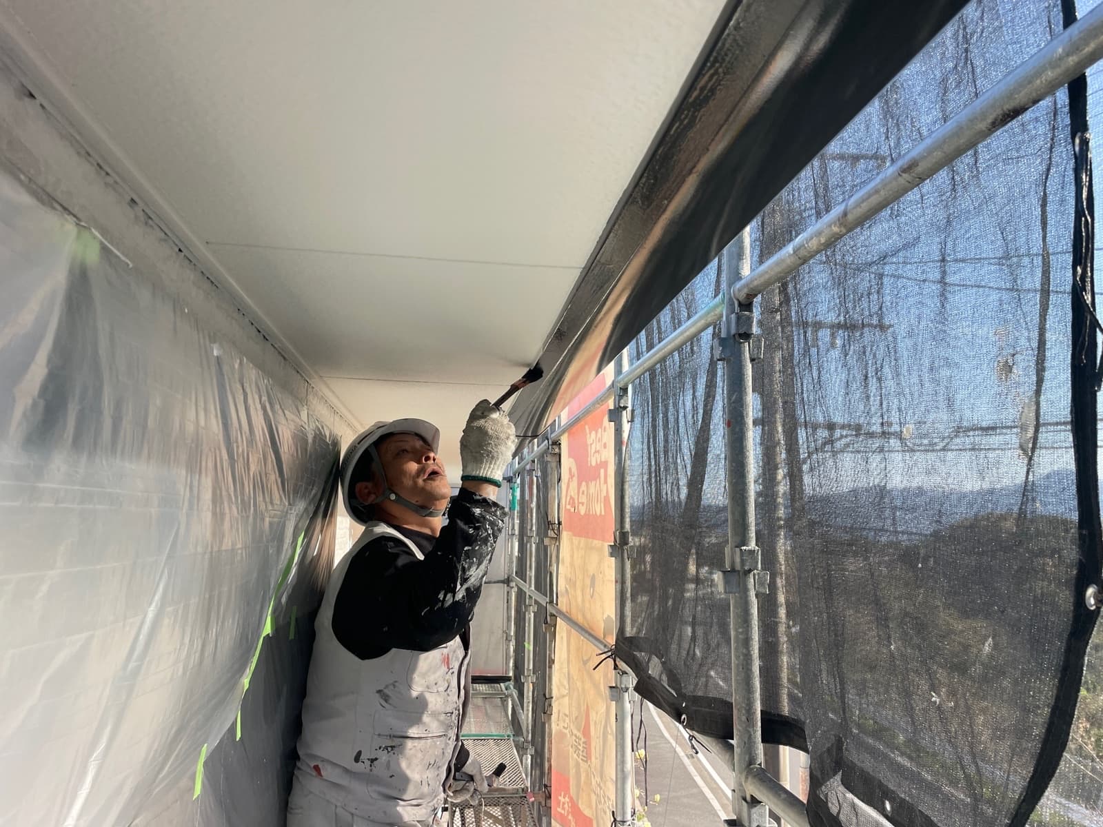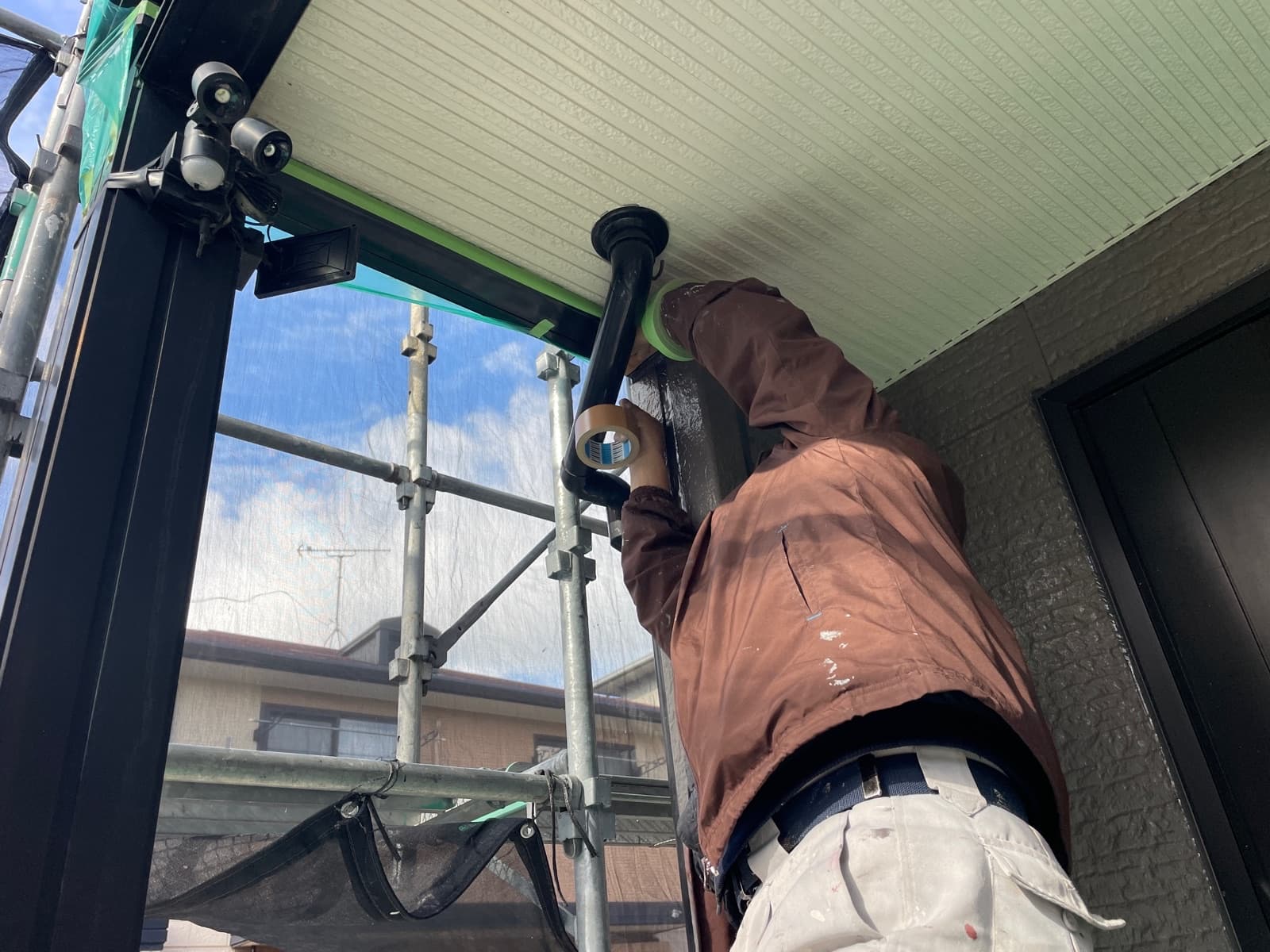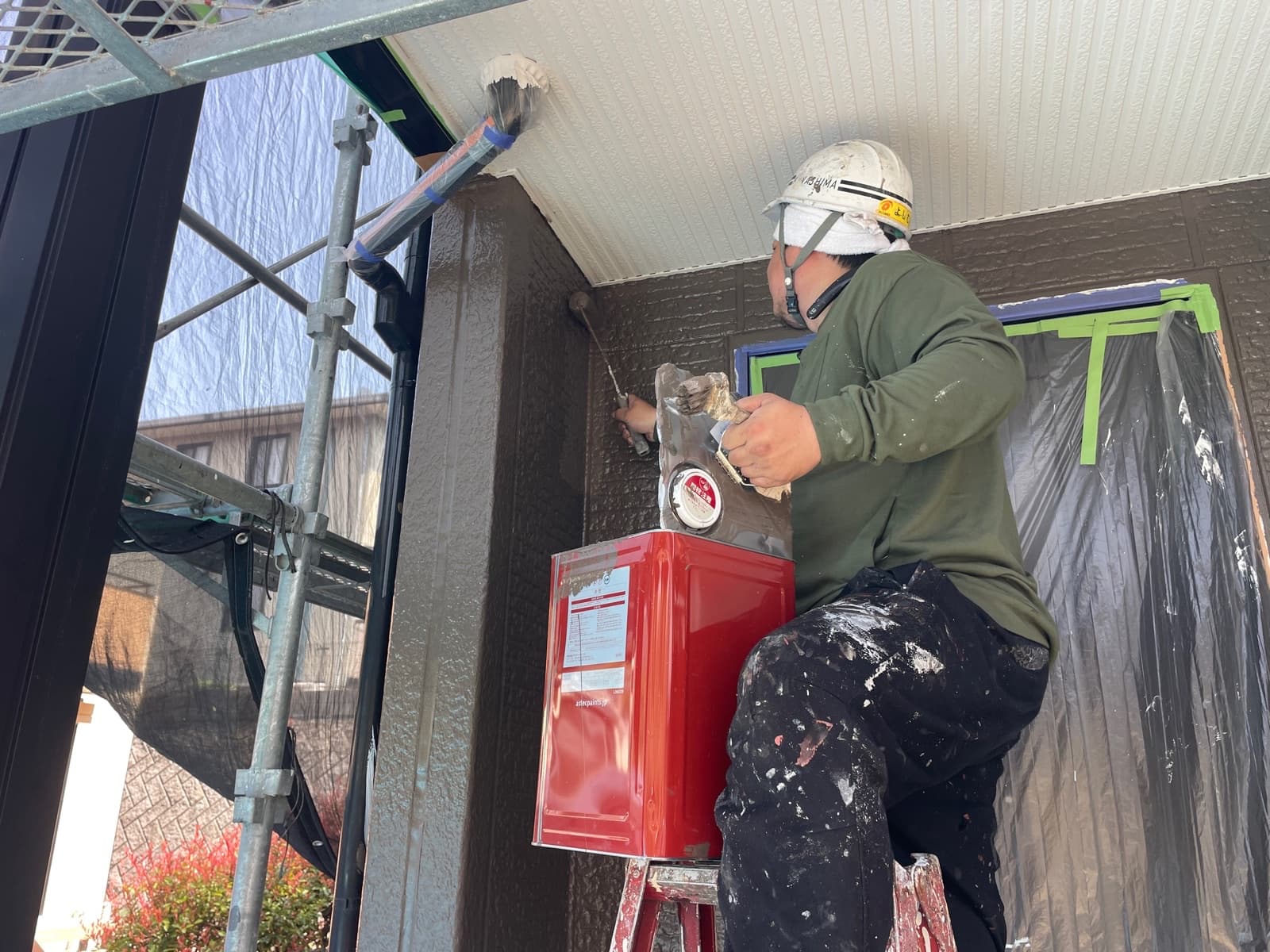 本日は外壁下塗り1回目、鉄部錆止め、軒天塗装をさせて頂いております。