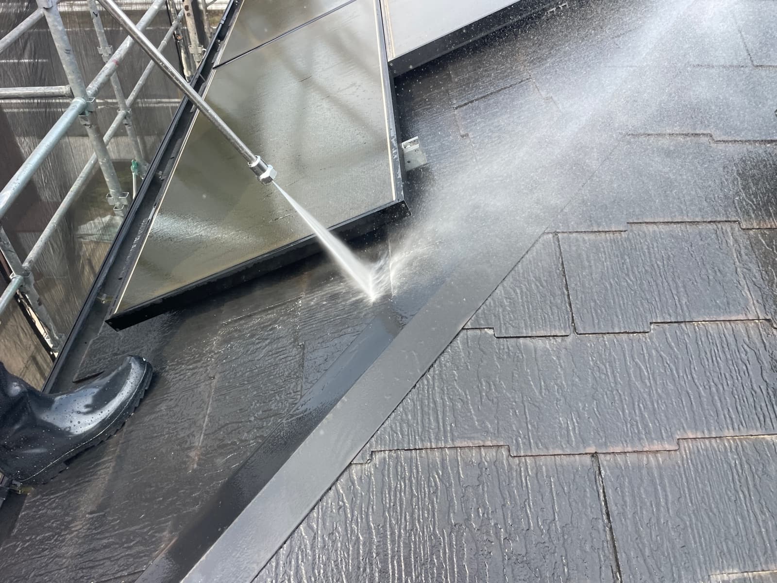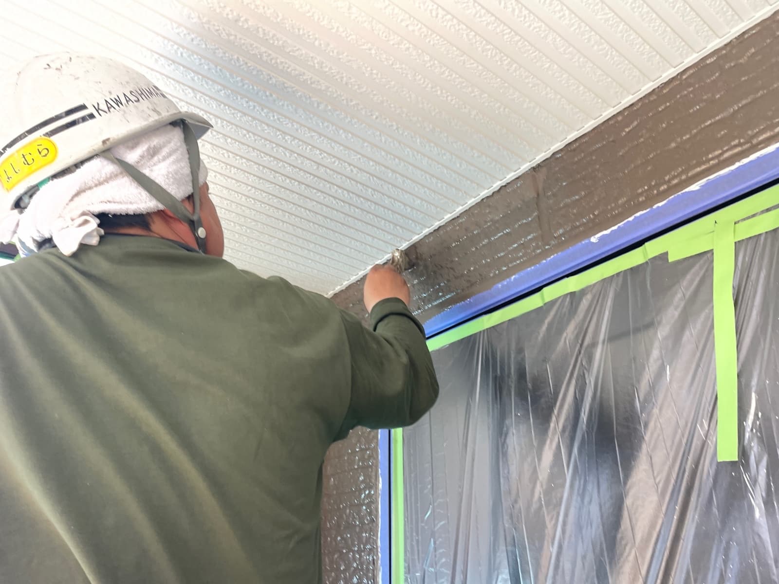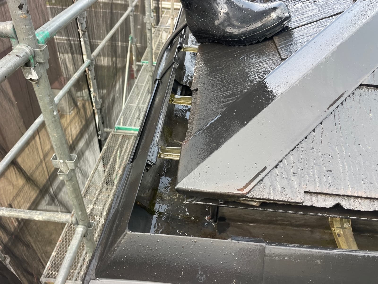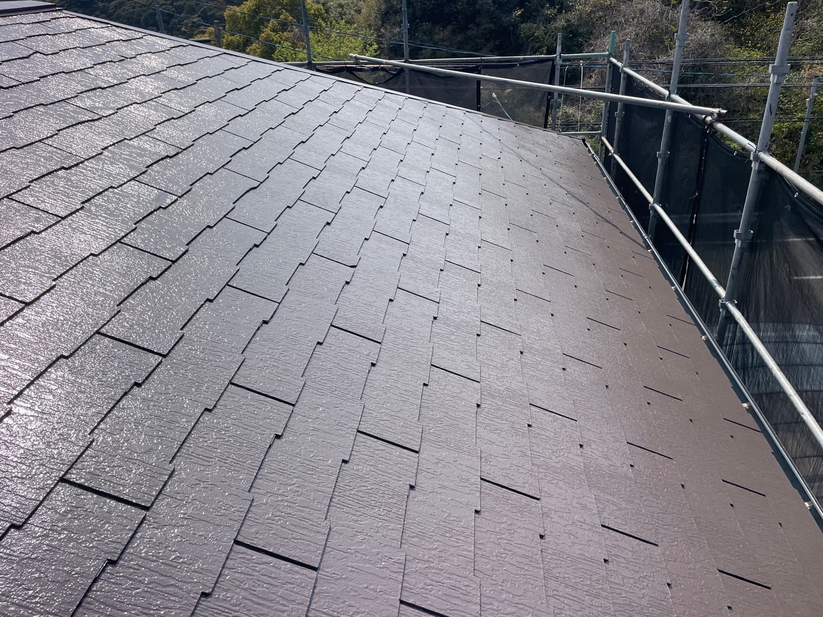 本日は外壁上塗り2回目、付帯部塗装、屋根上塗り1回目をさせて頂いております。