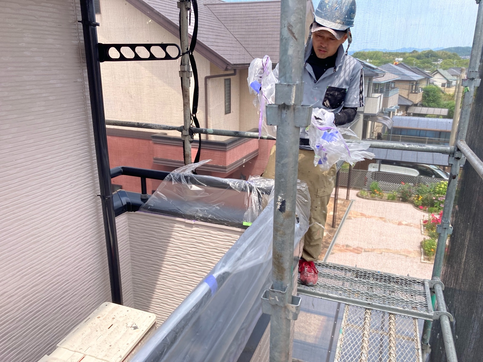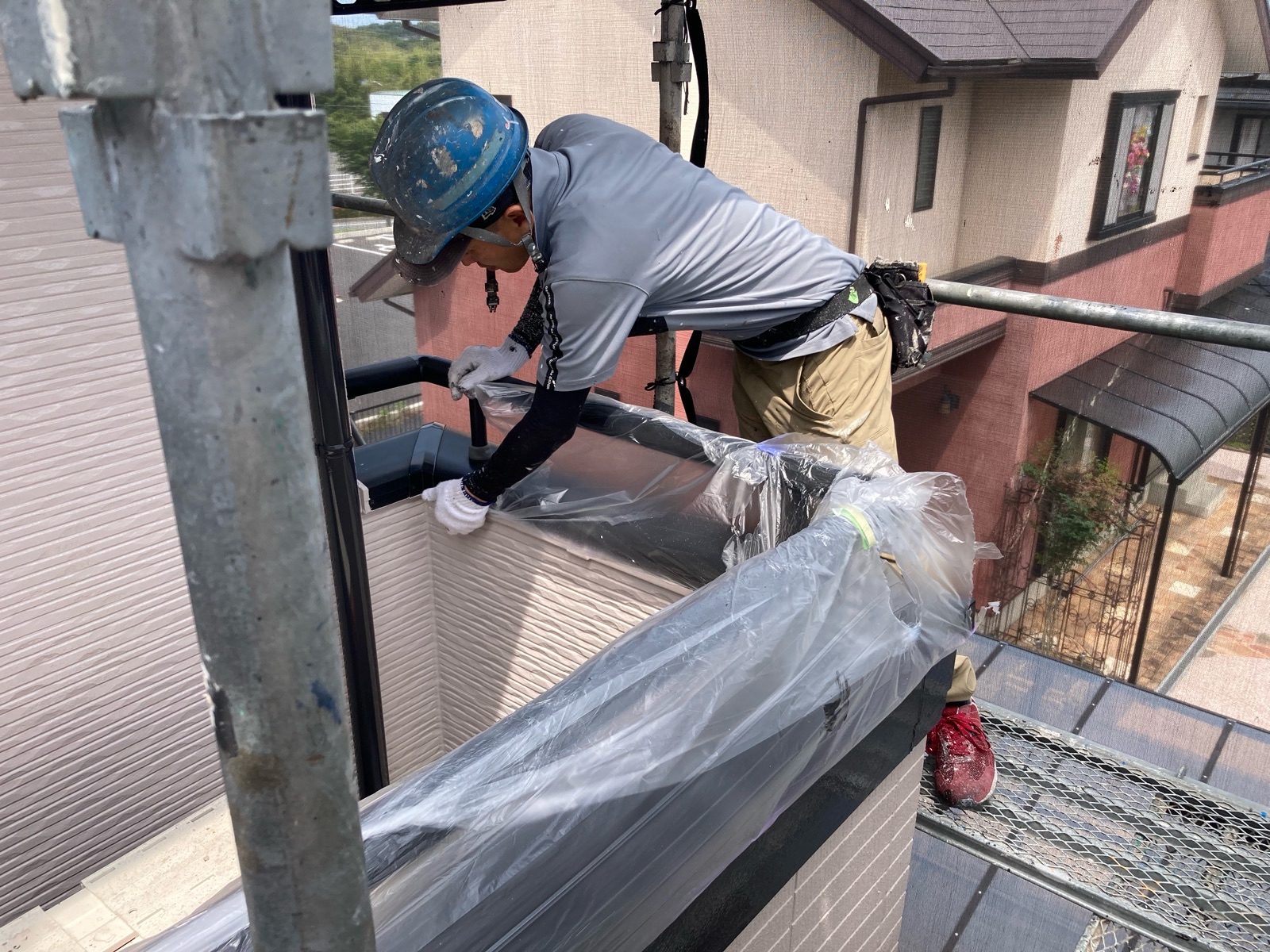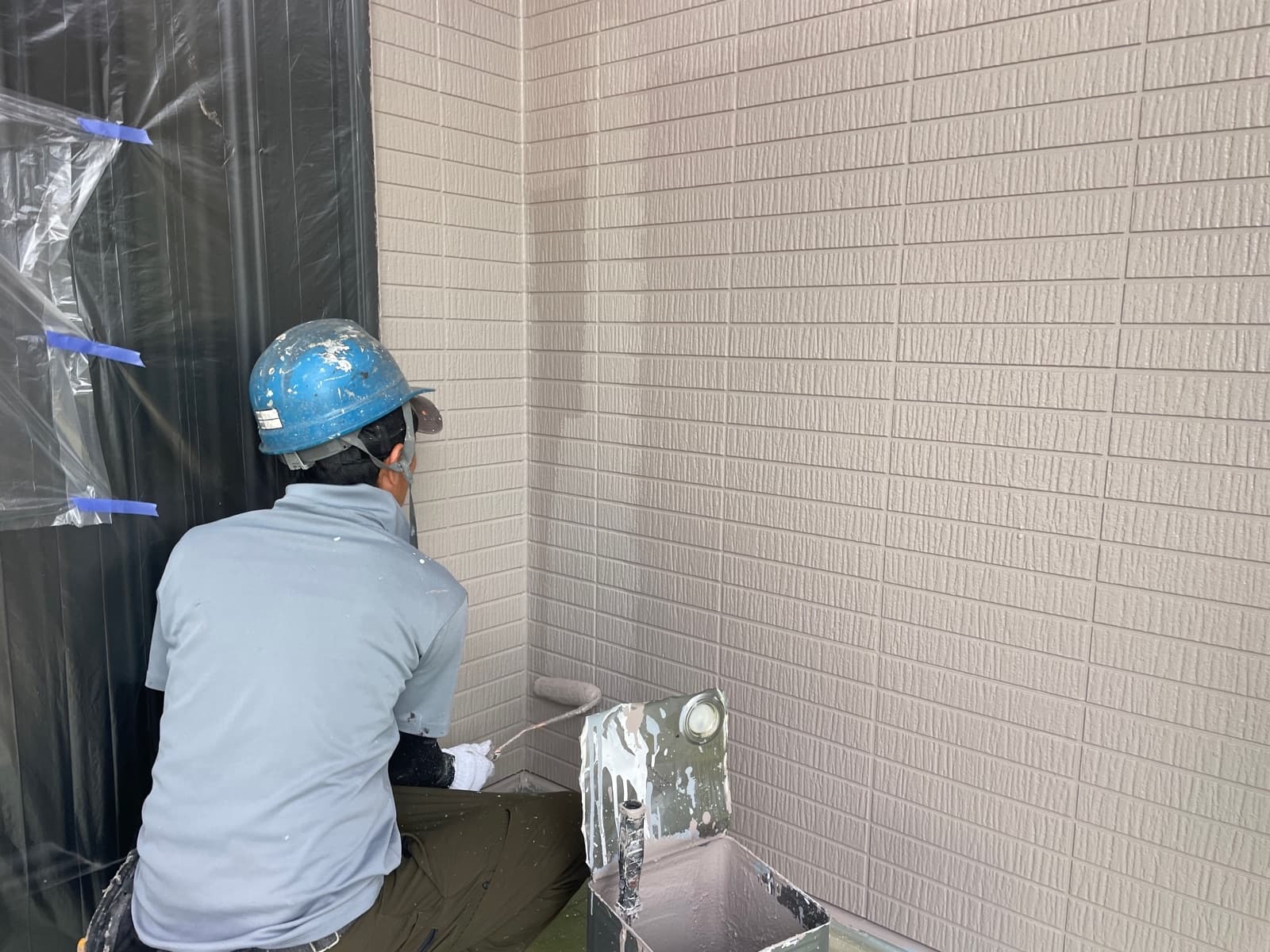本日は養生、外壁バリアー及び下塗り1回目をさせて頂いております。