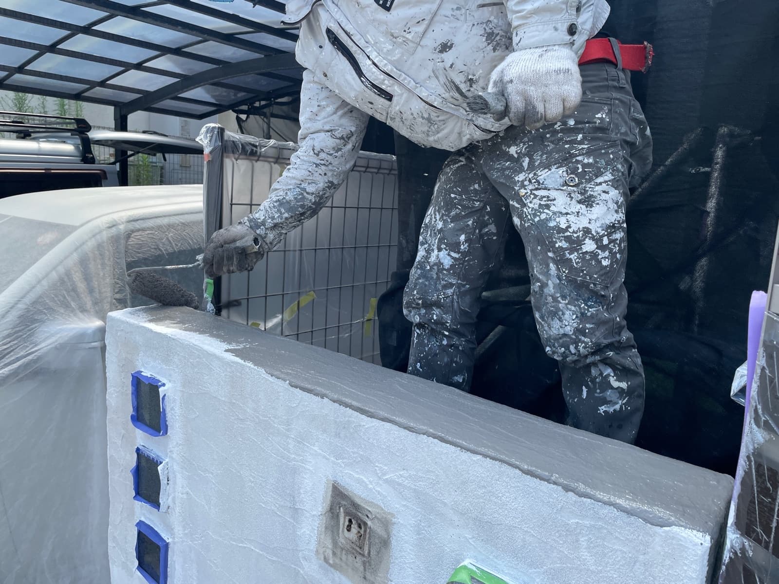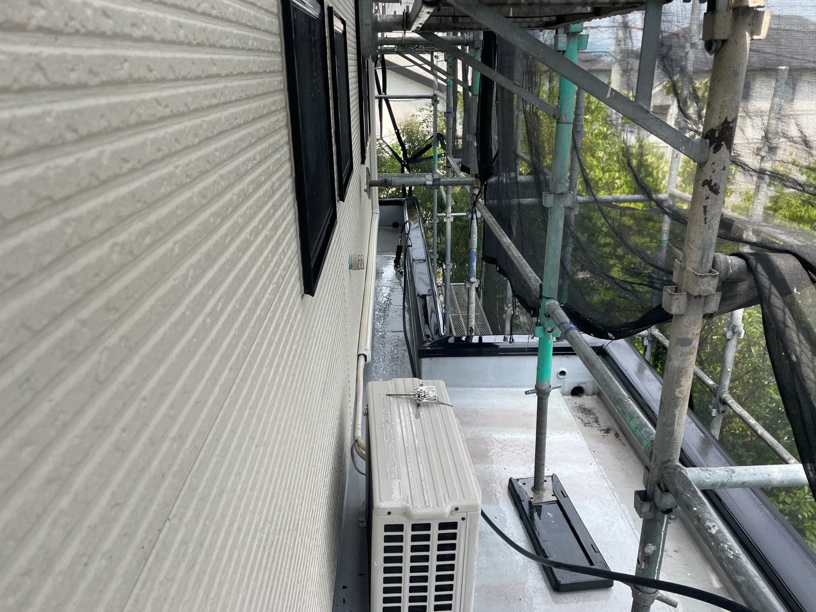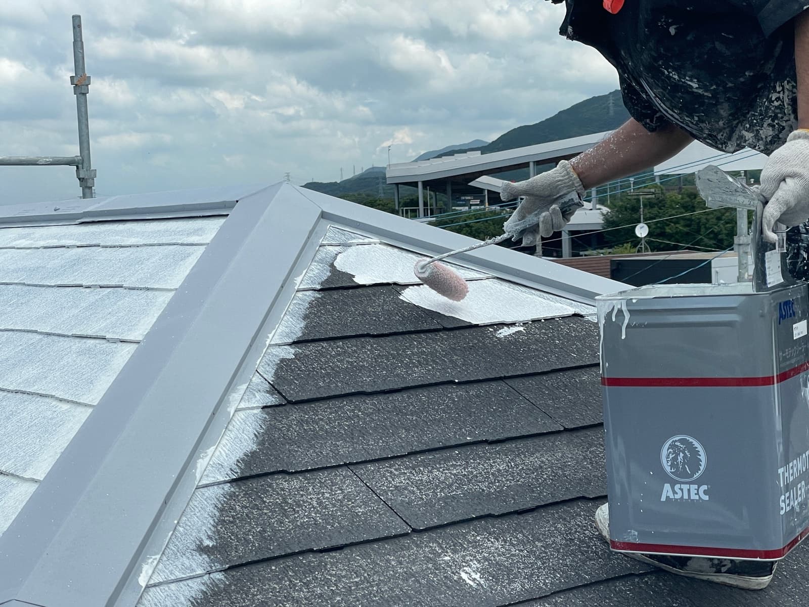 ●●シーリング工事、養生、屋根下塗り1回目