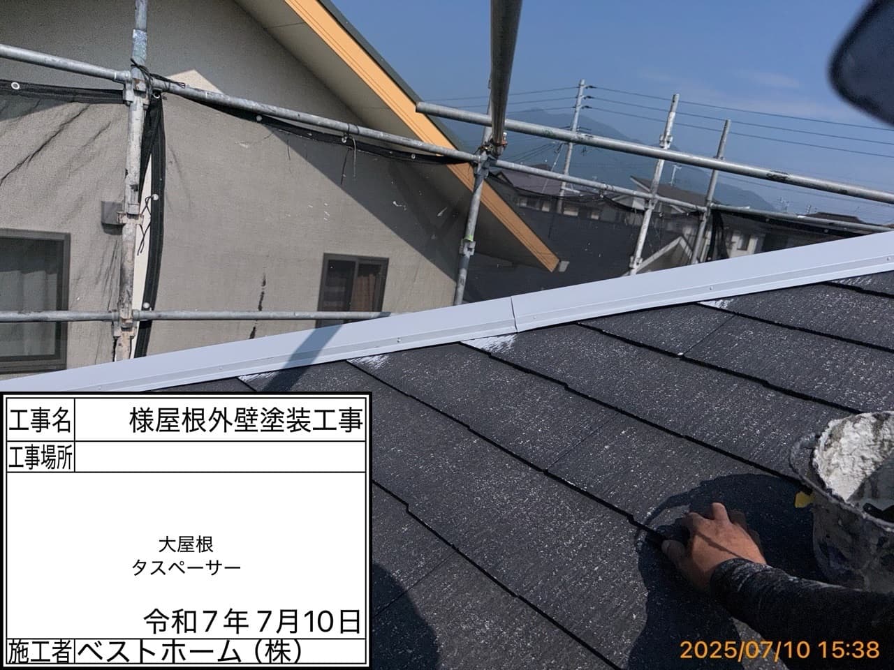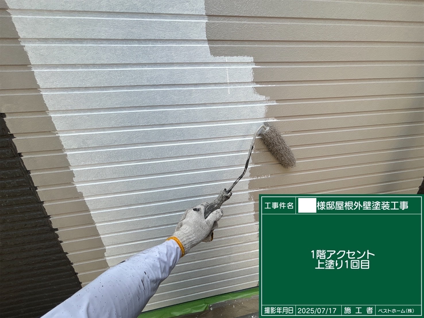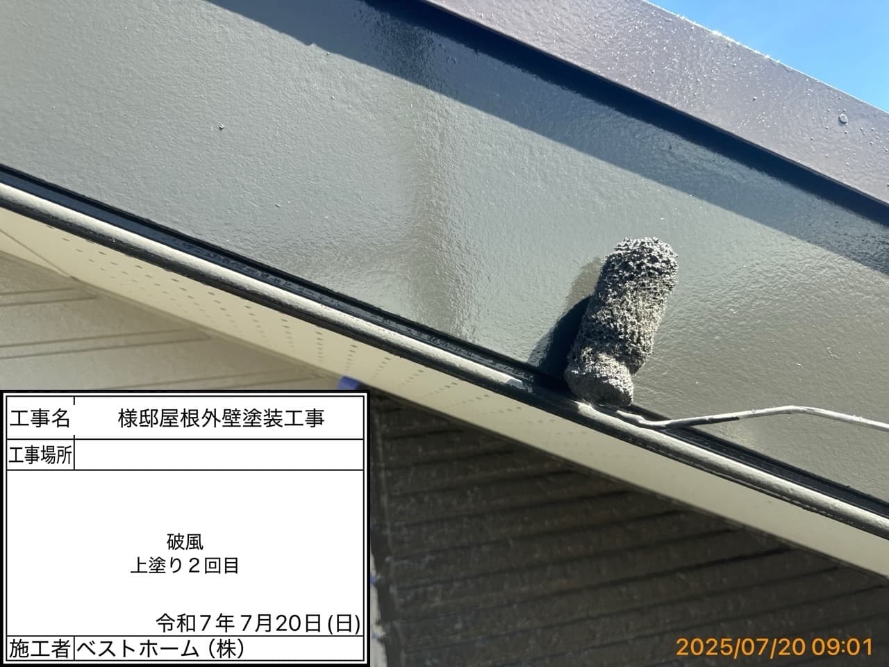 次回施工・・・屋根上塗り1回目、外壁下塗り2回目、中間検査、付帯部塗装