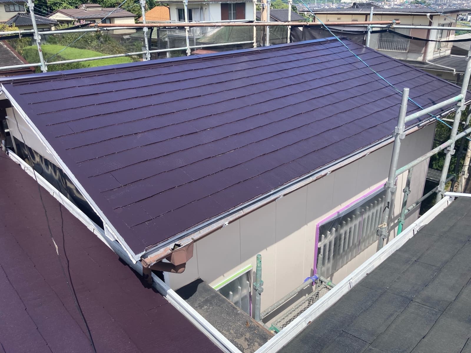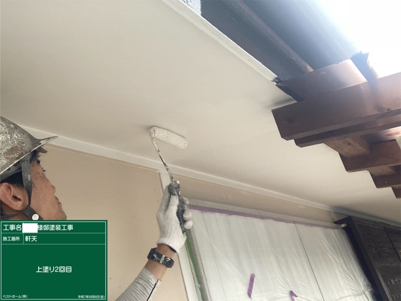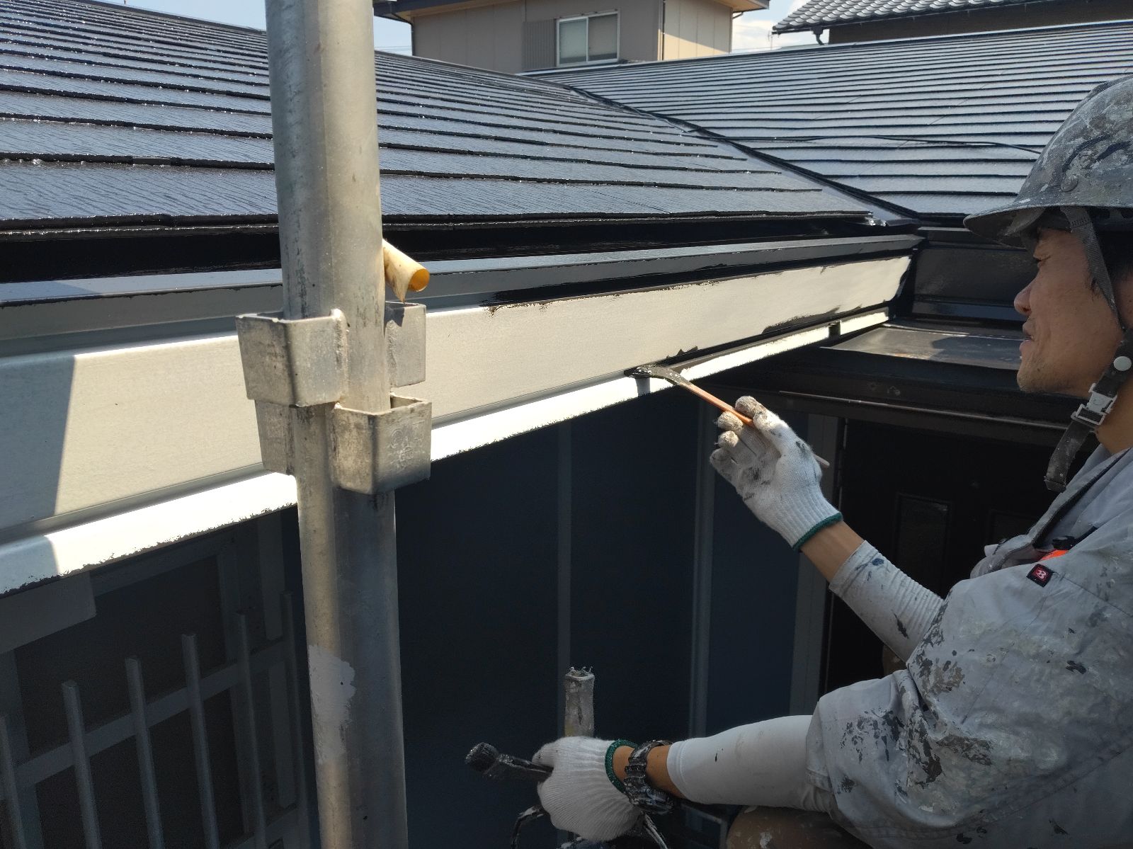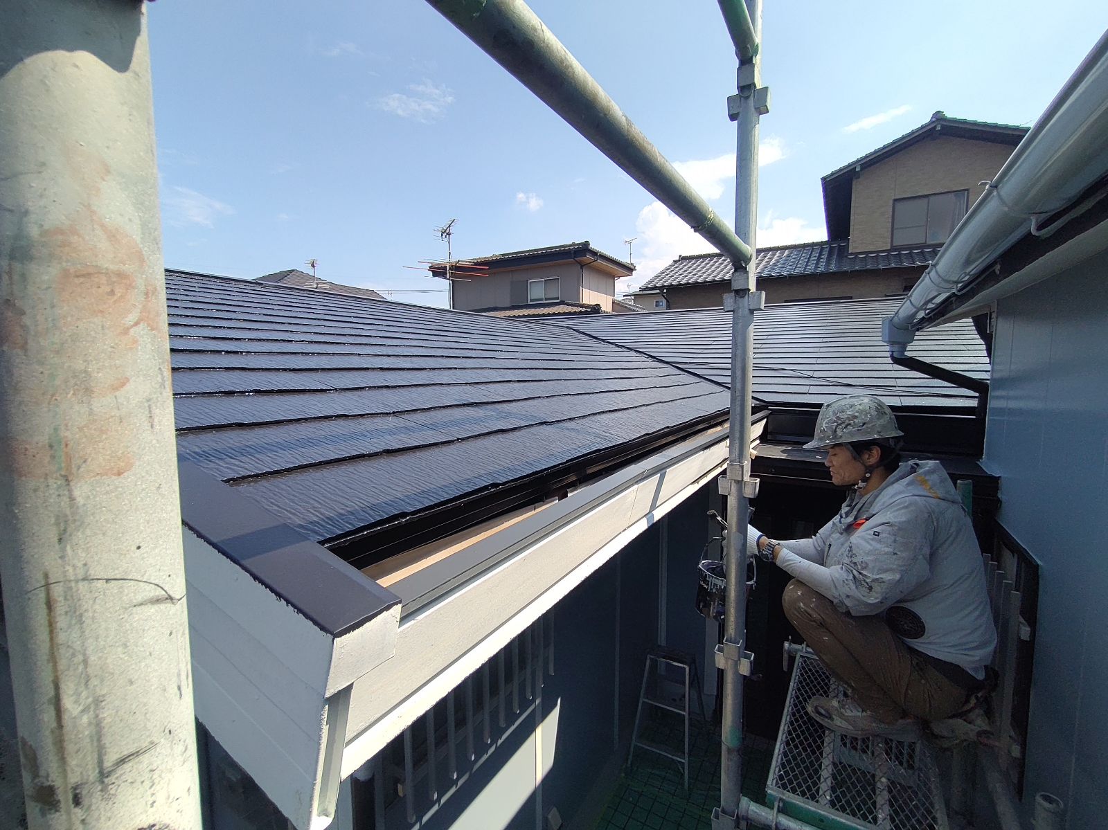 本日は屋根上塗り、付帯部塗装、軒天塗装をさせて頂いております。