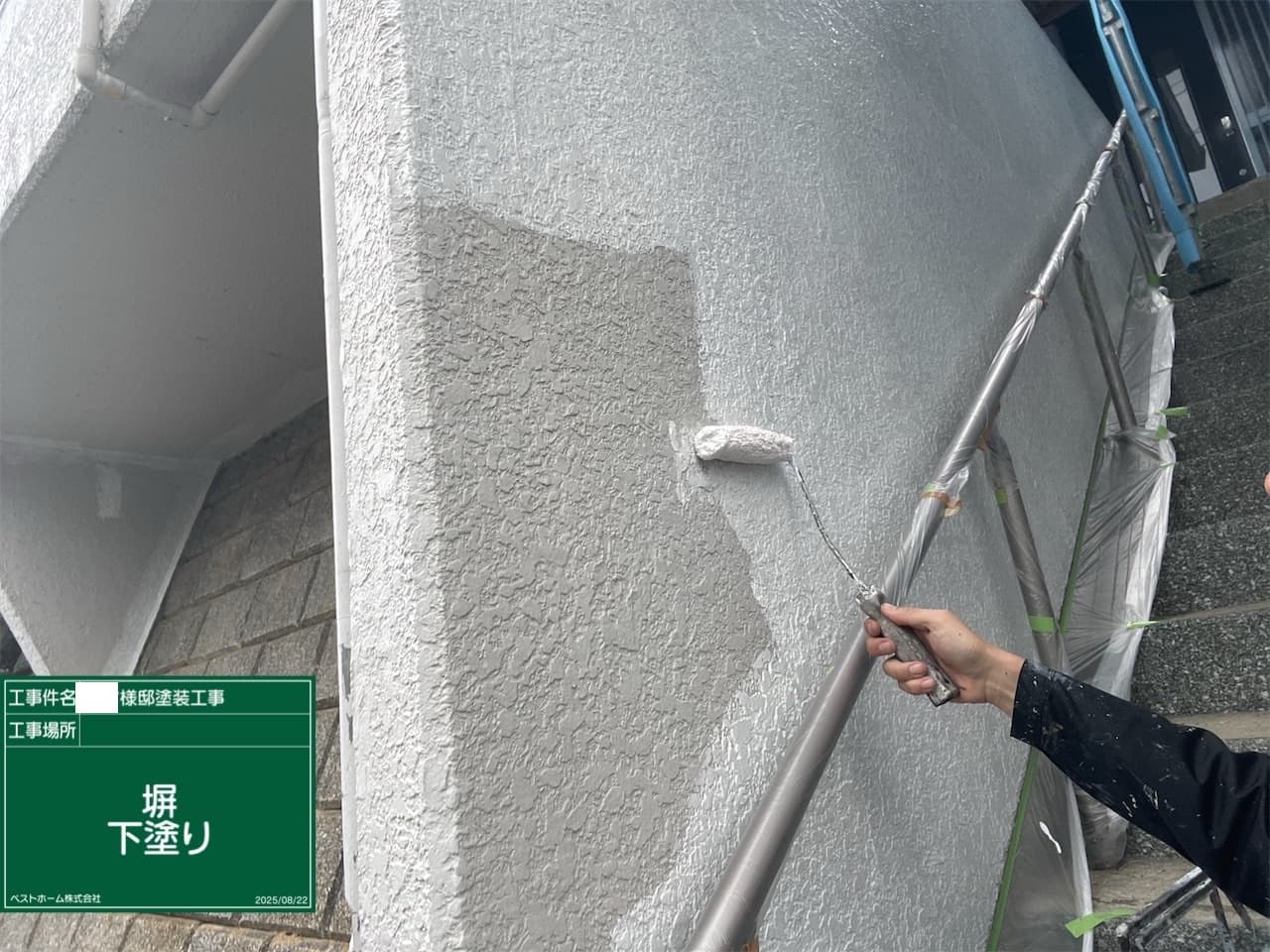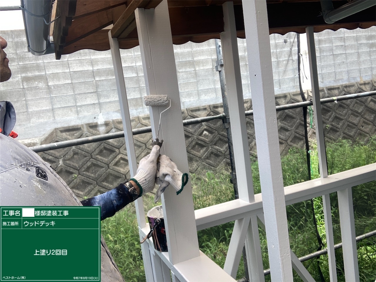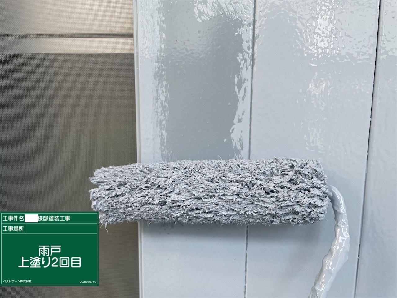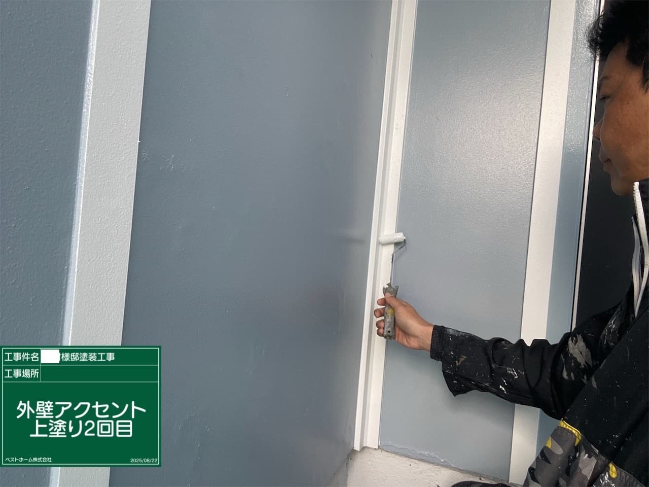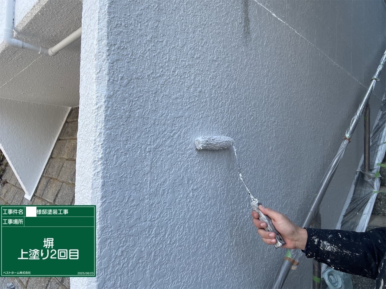 ●●外壁上塗り2回目、付帯部塗装、塀下塗り