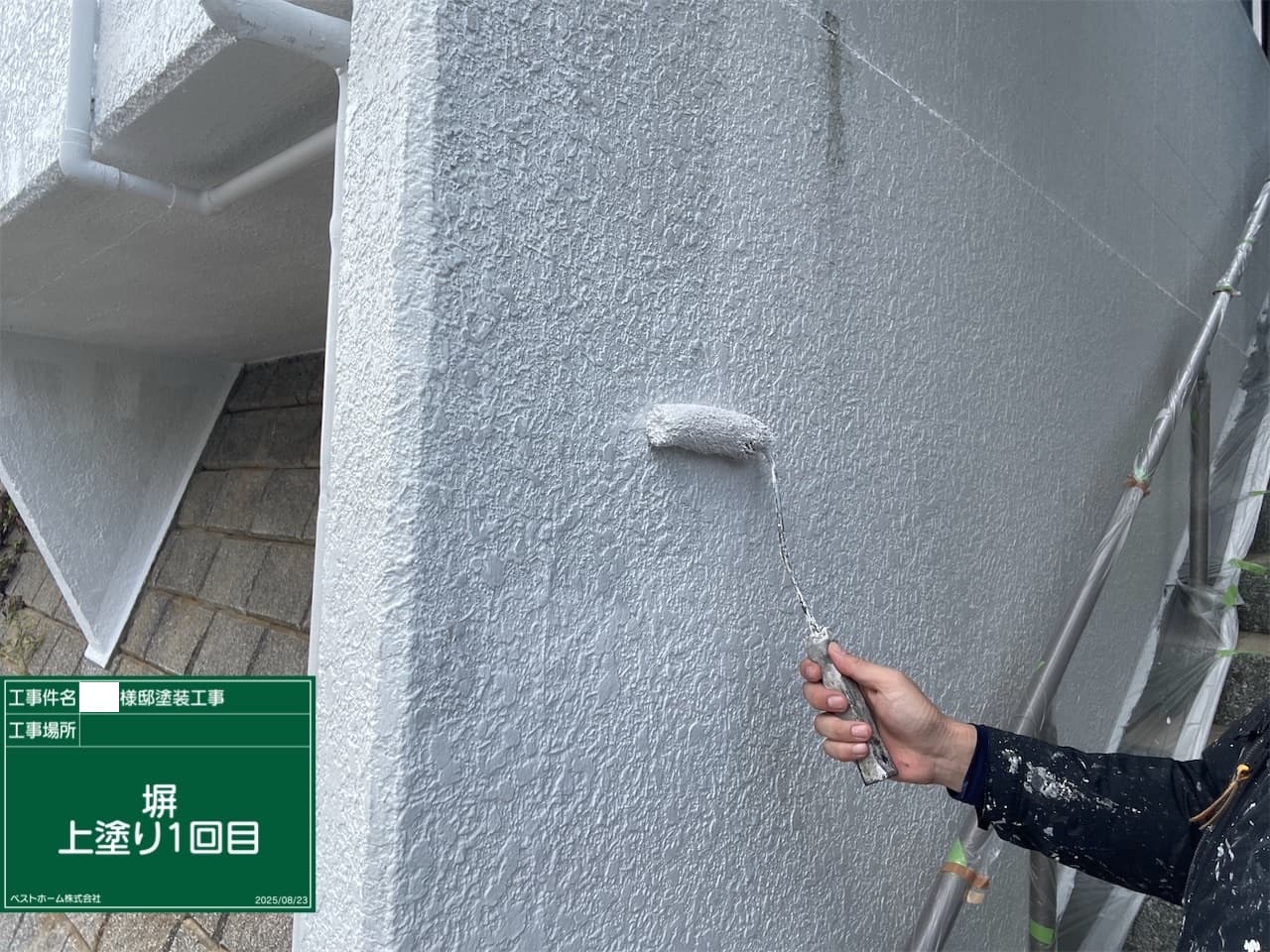 本日は外壁上塗り2回目、付帯部塗装、塀下塗りをさせて頂いております。