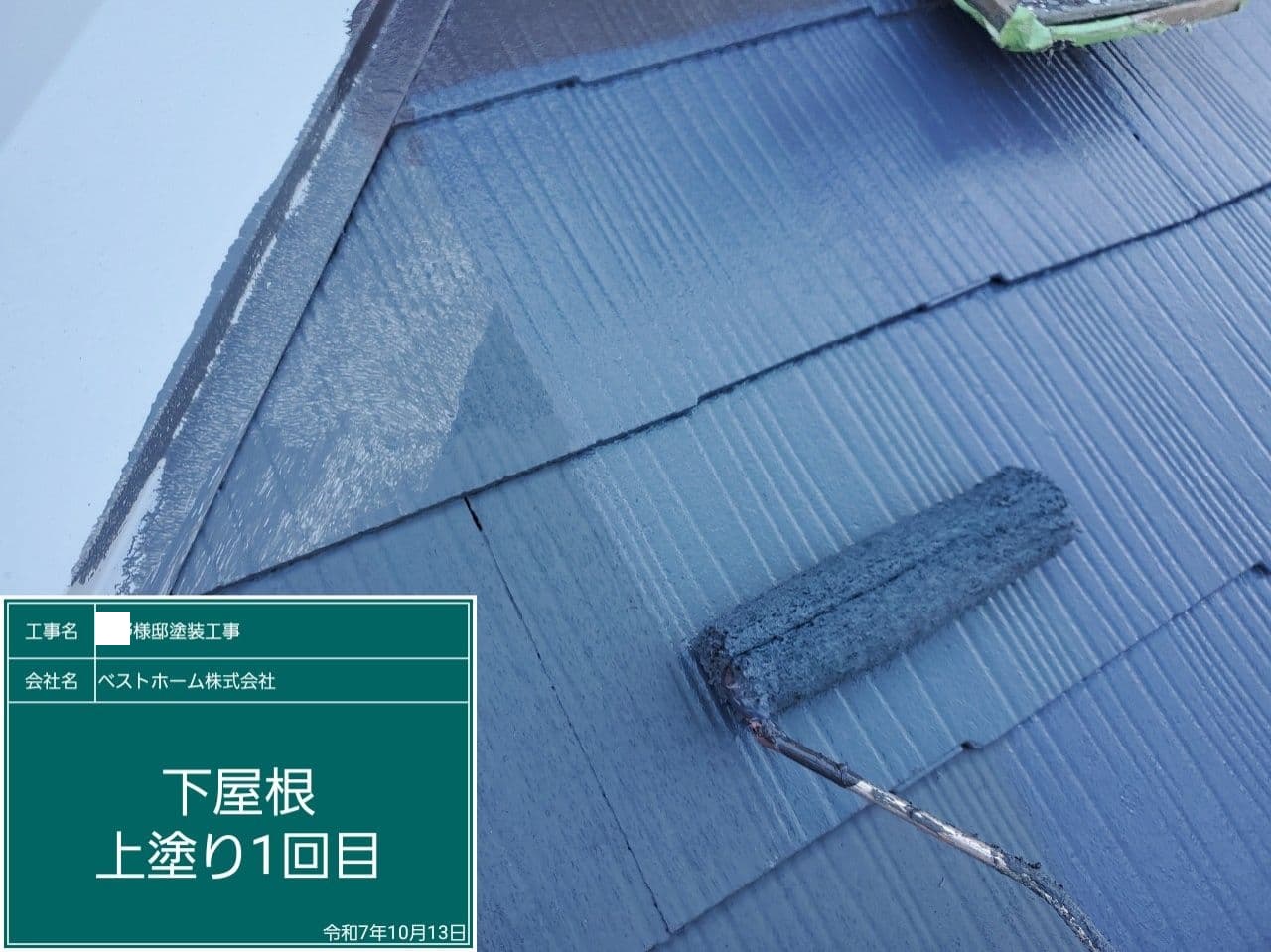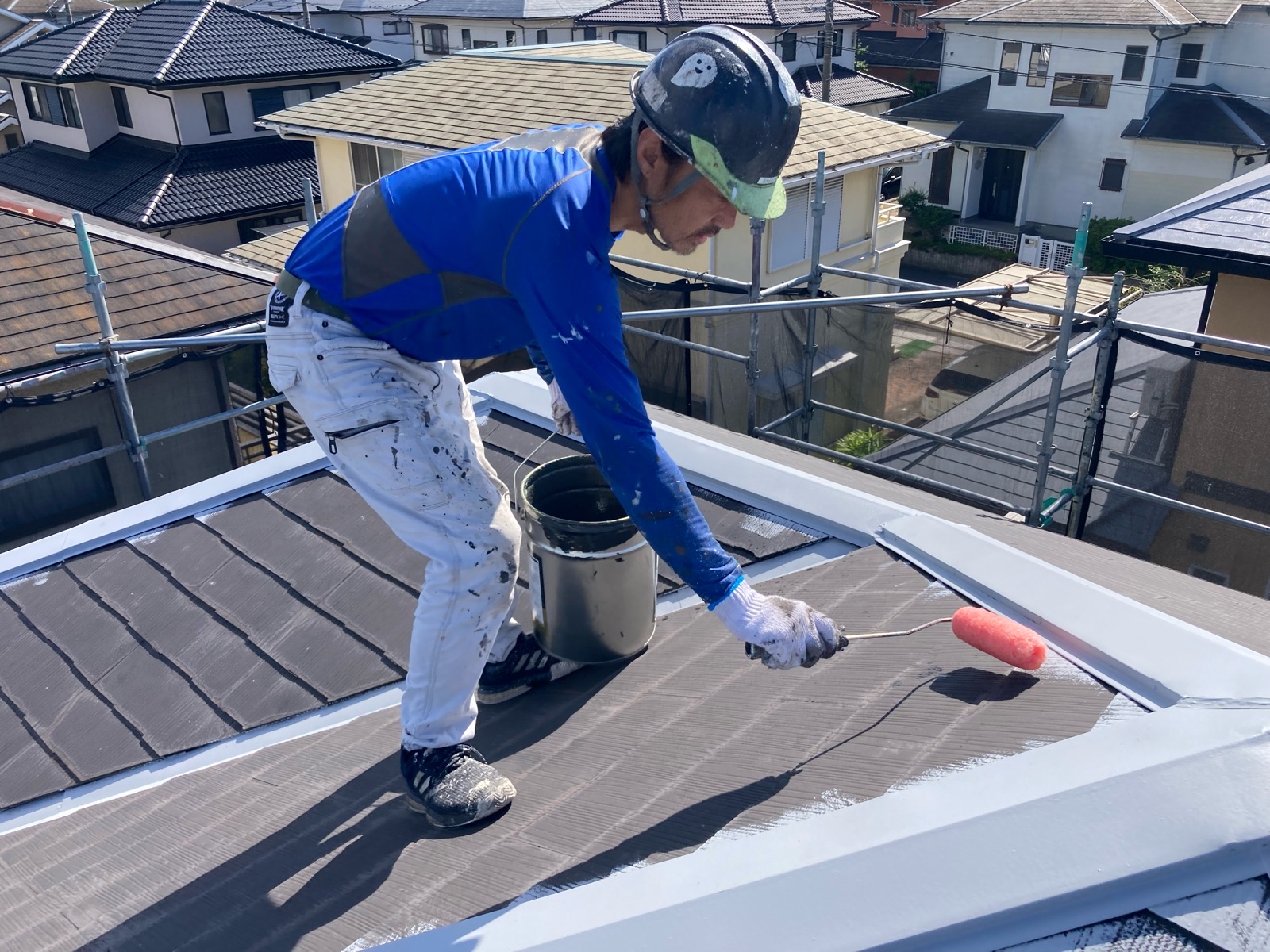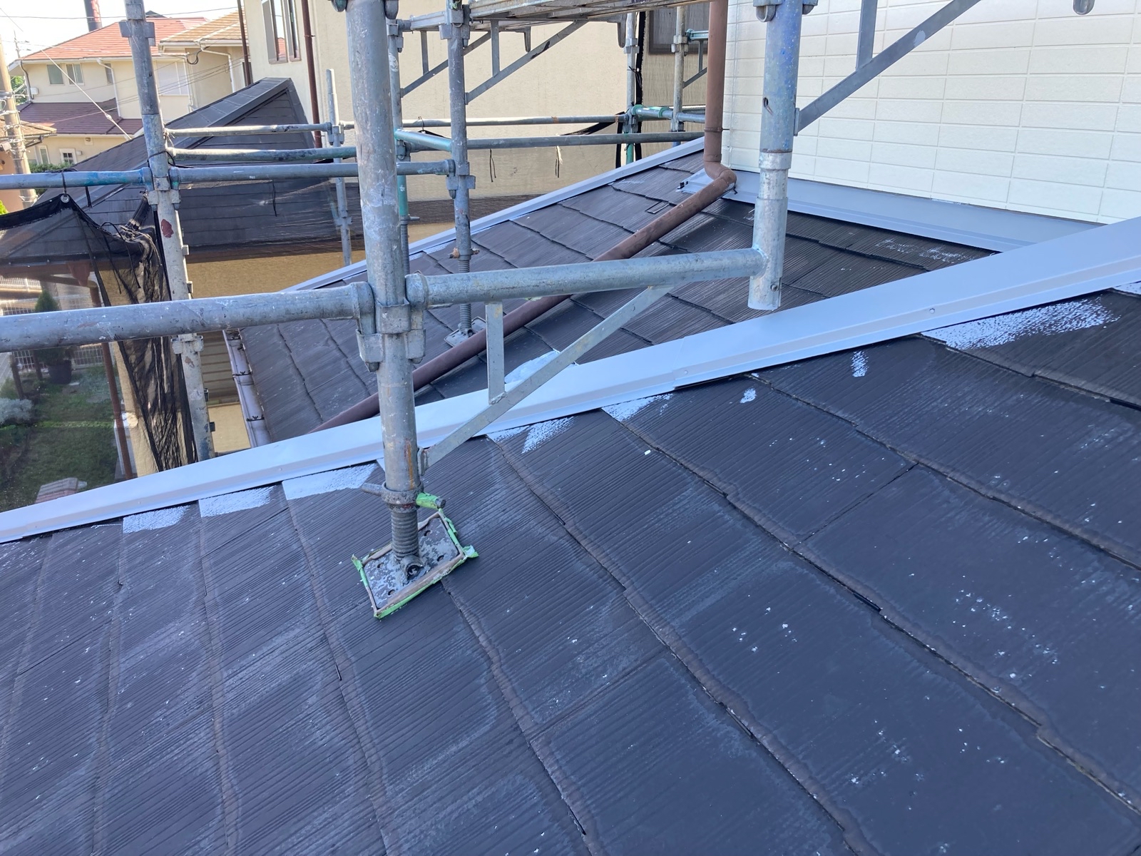 本日は屋根板金錆止め、屋根下塗り1回目をさせて頂いております。