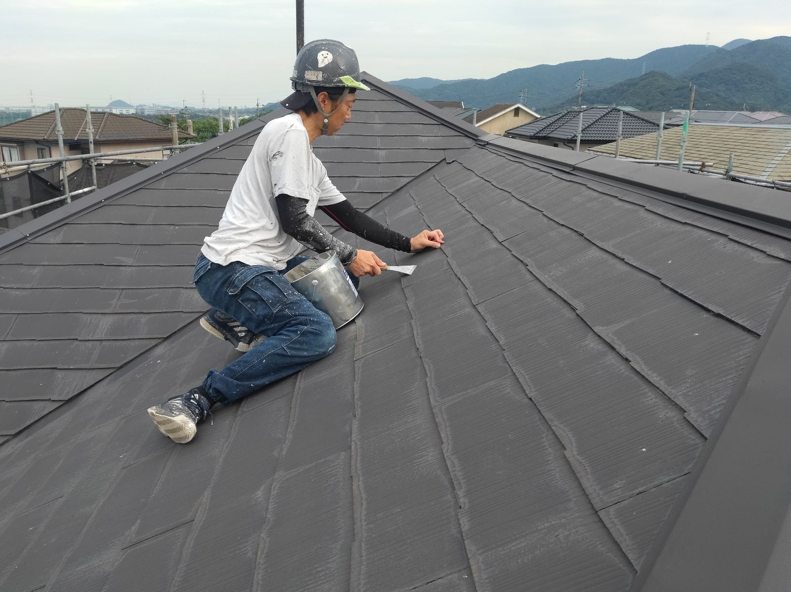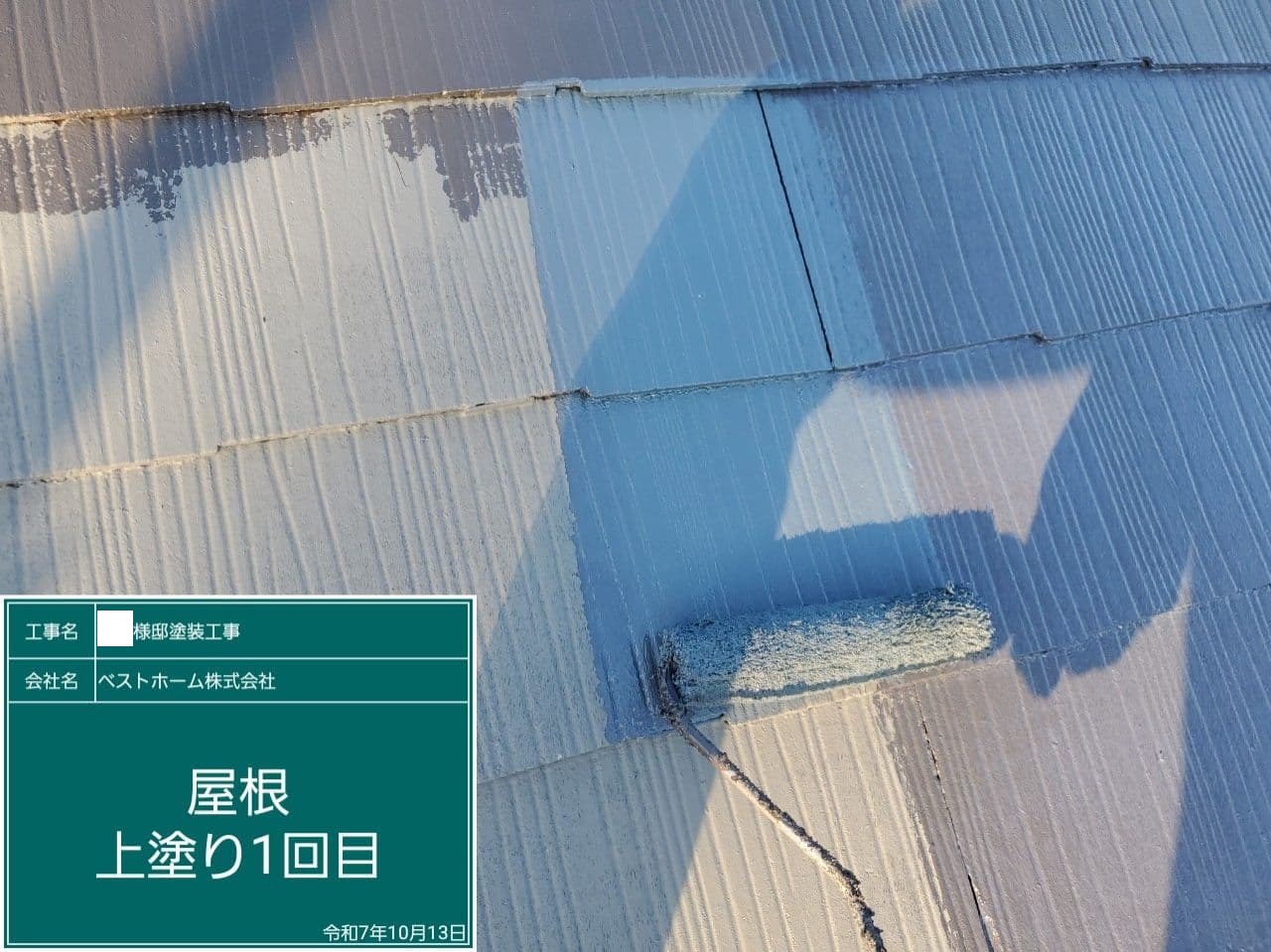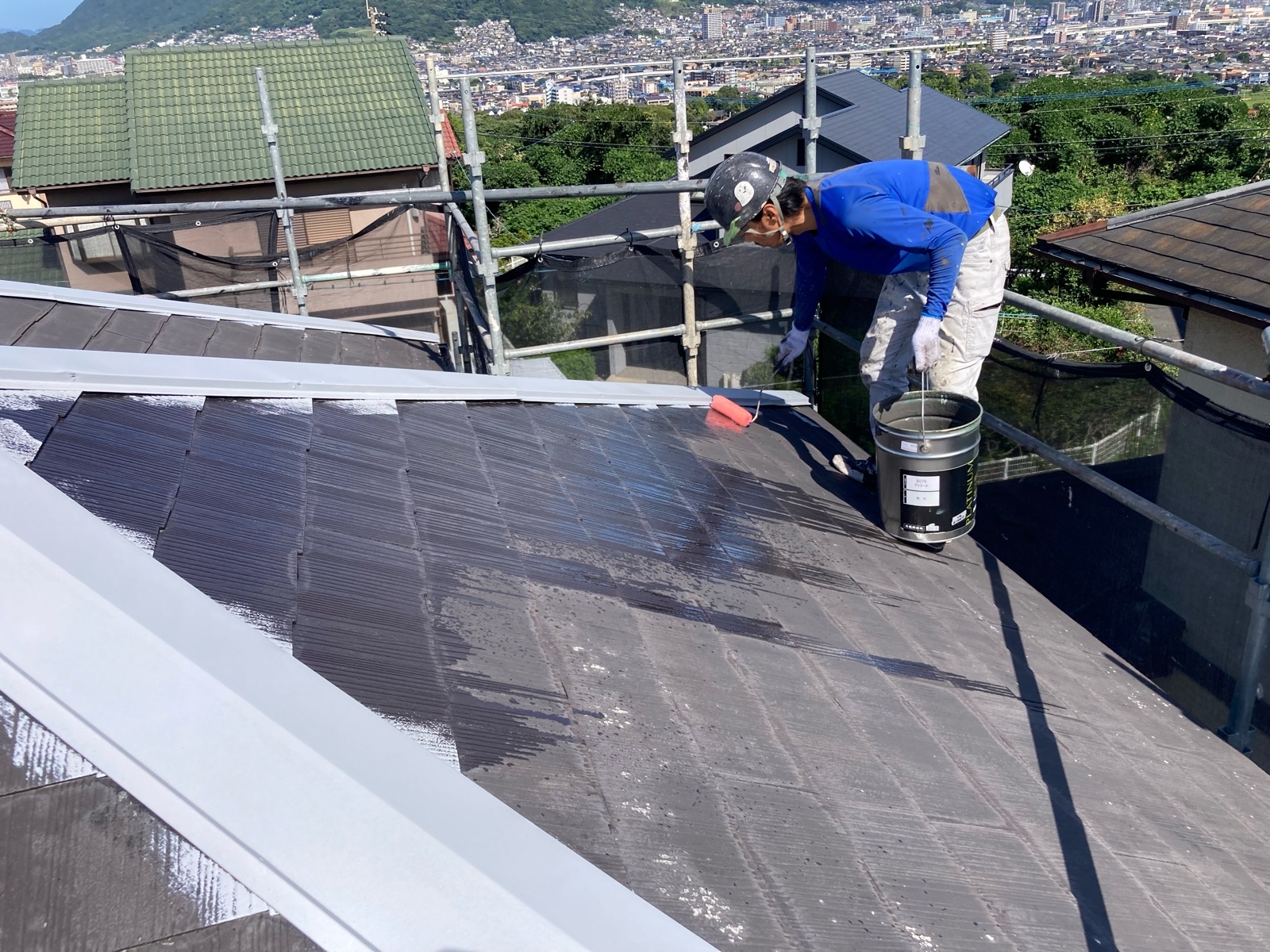本日は屋根板金錆止め、屋根下塗り1回目をさせて頂いております。