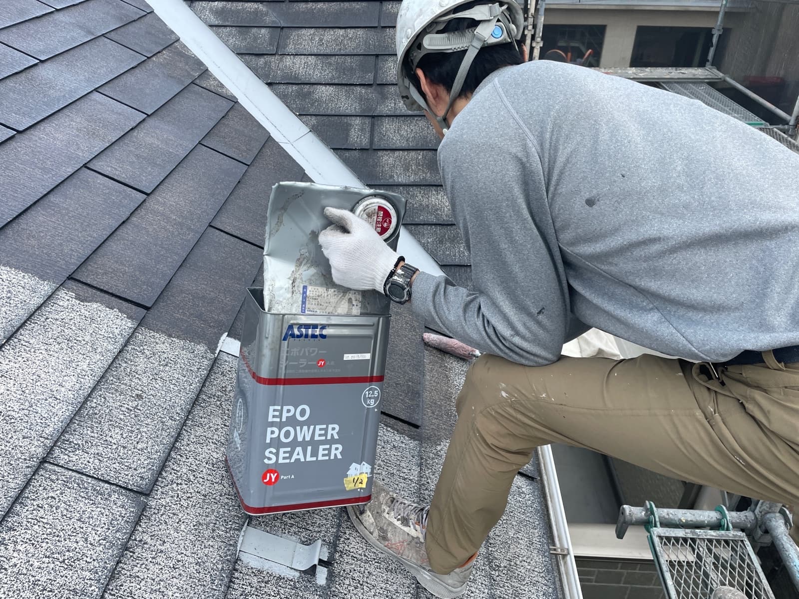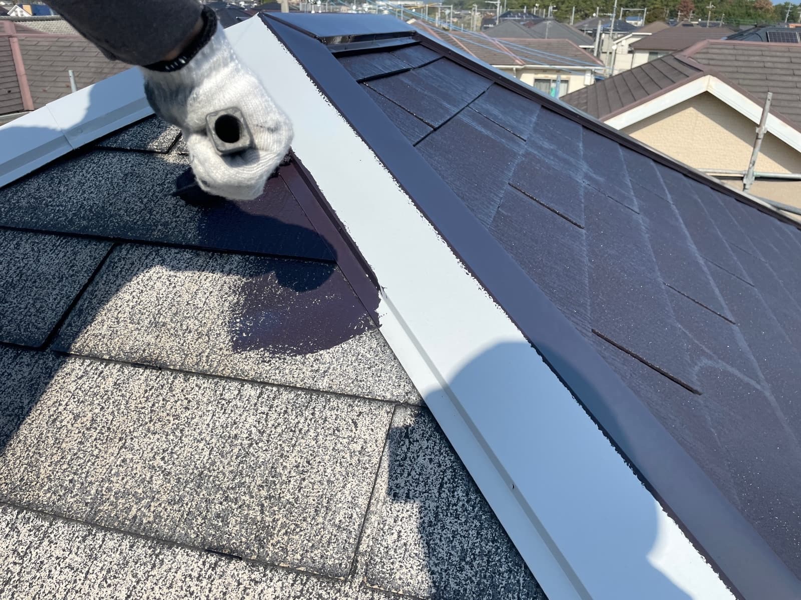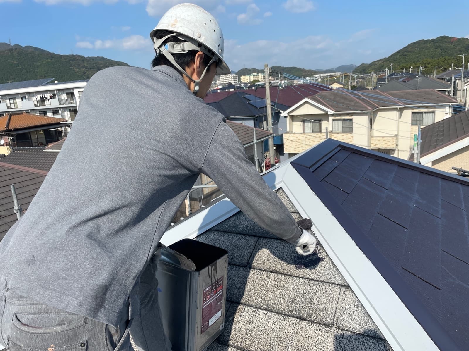 本日は屋根上塗り1回目、シーリング工事をさせて頂いております。