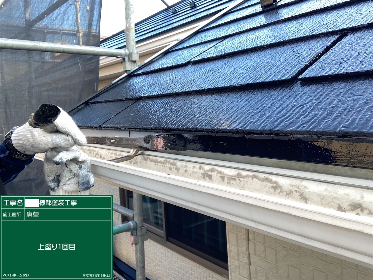 本日は屋根下塗り2回目・中間検査、鉄部錆止めをさせて頂いております。