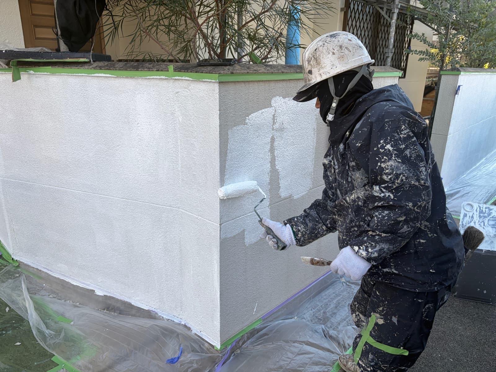 次回施工・・・外壁下塗り1回目、補修部肌合わせ、逆養生