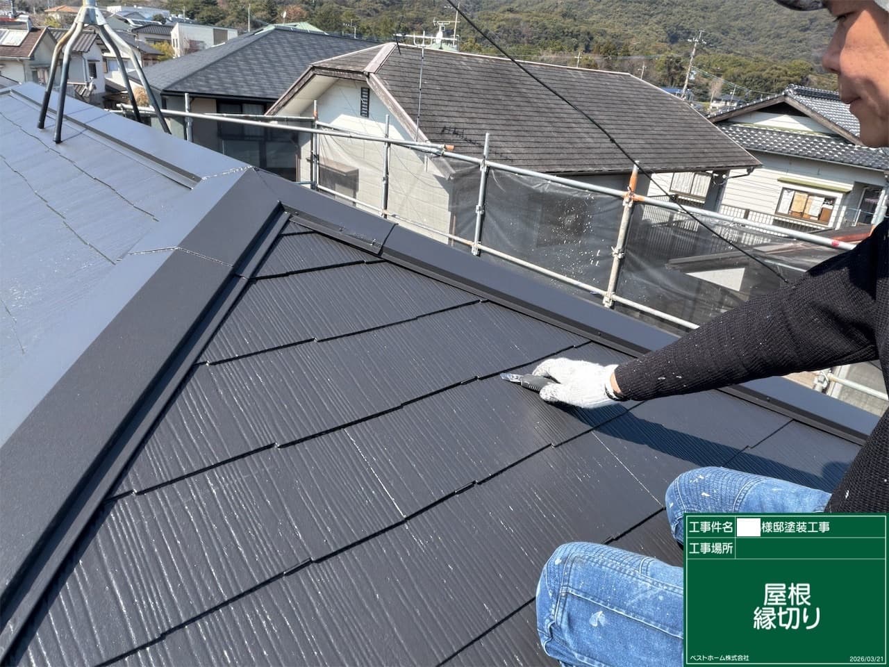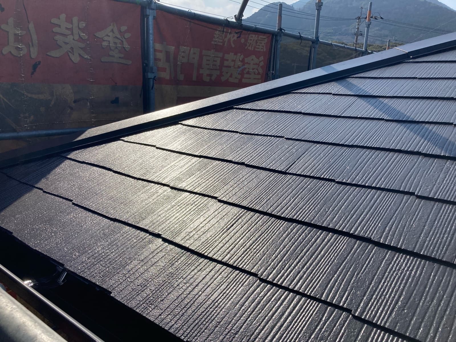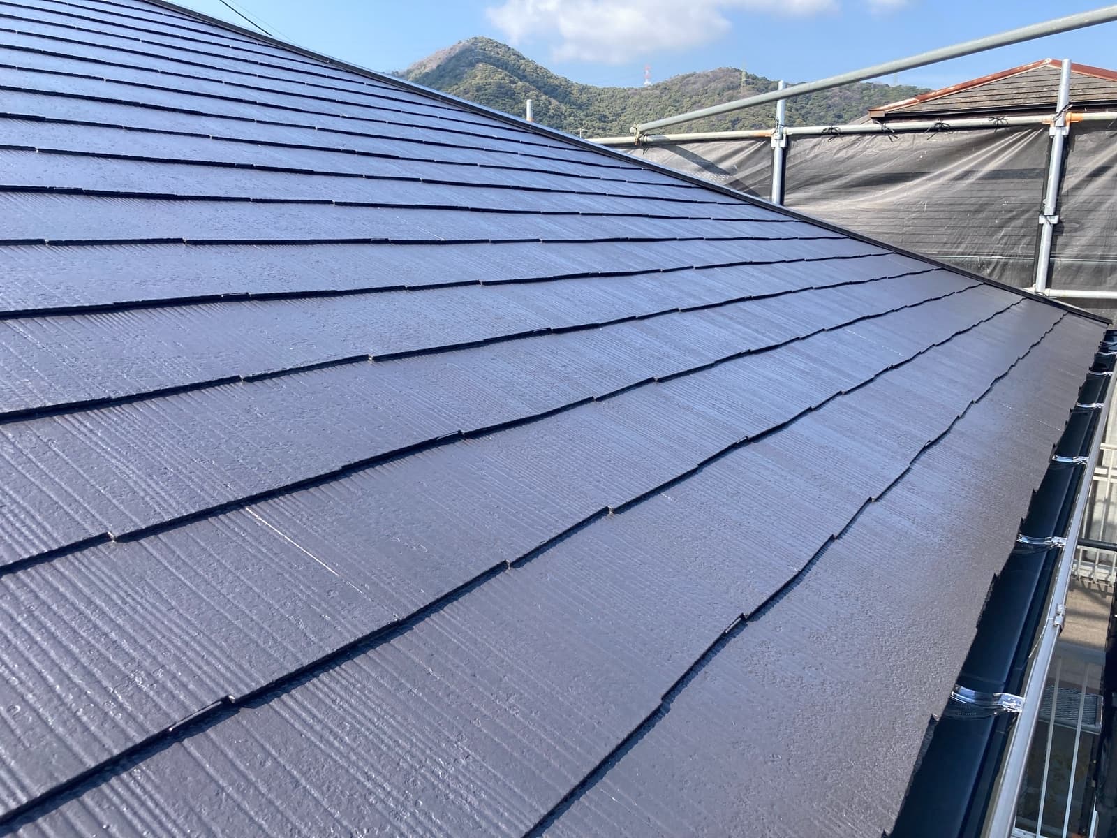 次回施工・・・屋根上塗り2回目、養生バラシ