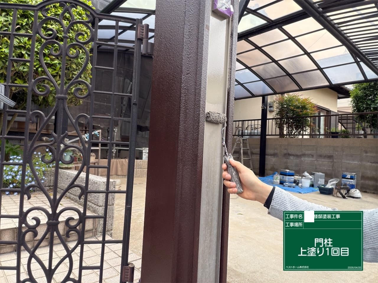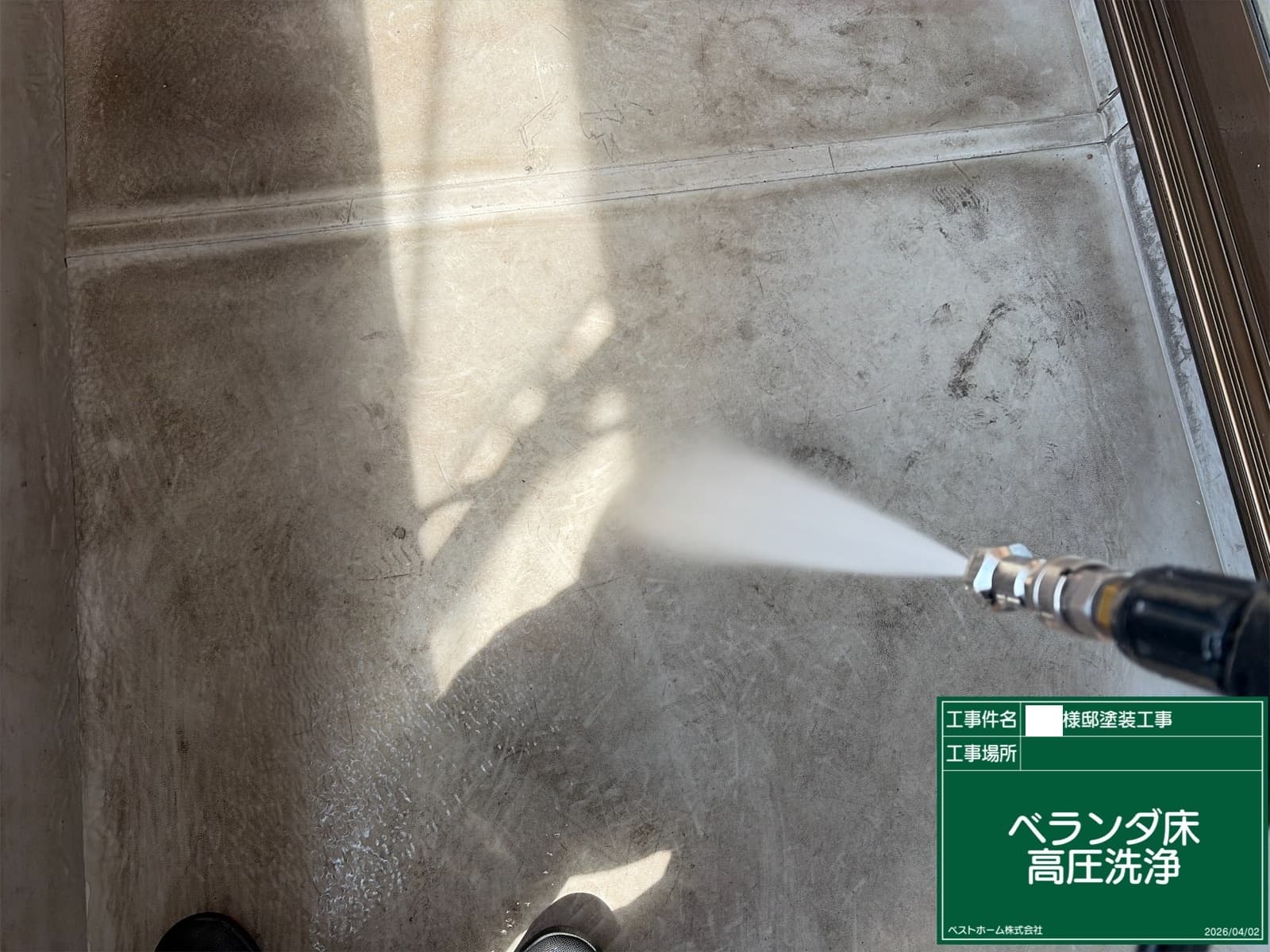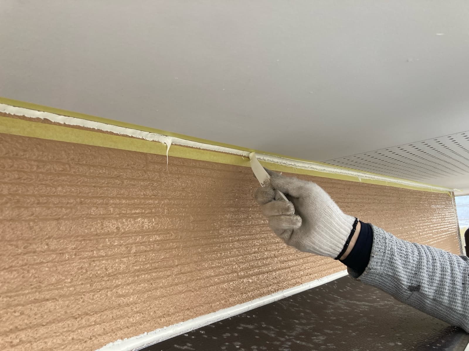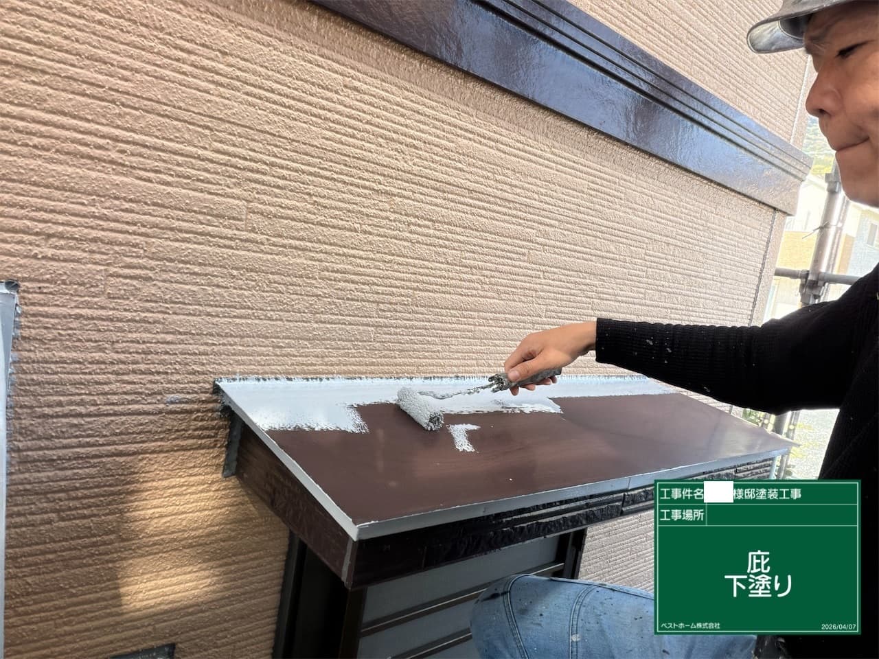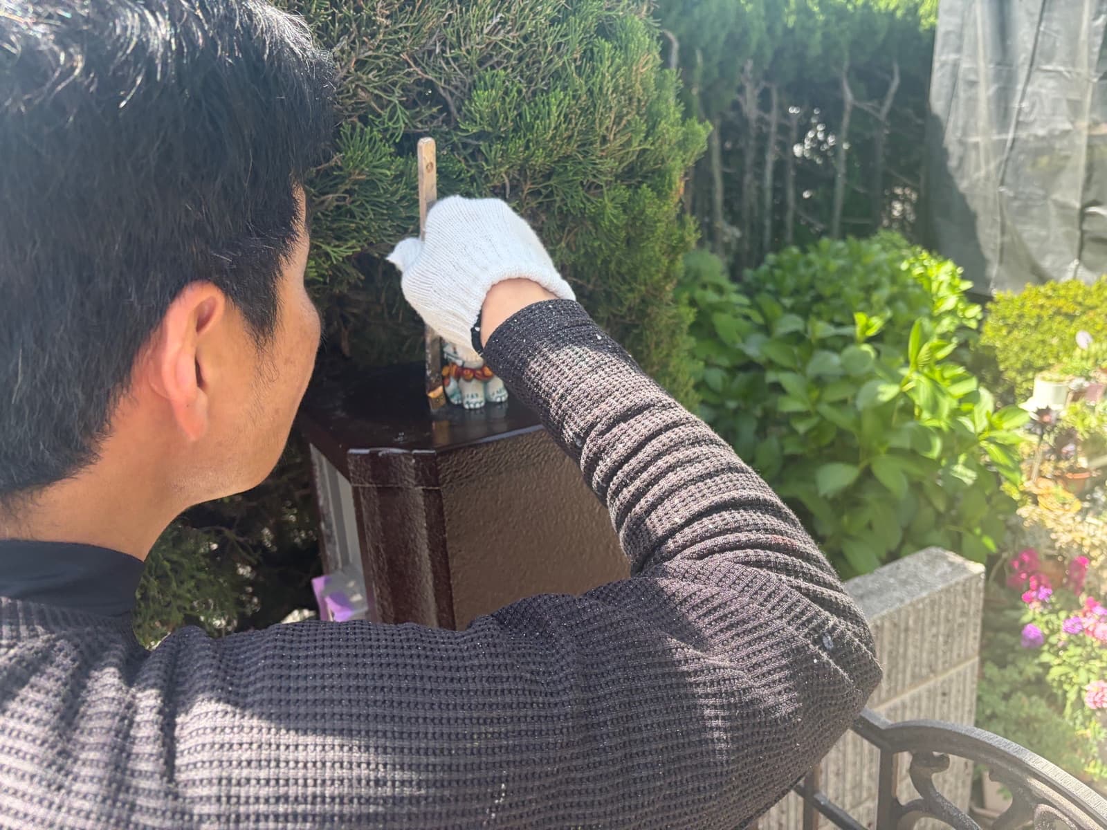 本日は付帯部塗装、ベランダ床塗装、下屋根上塗り2回目をさせて頂いております。