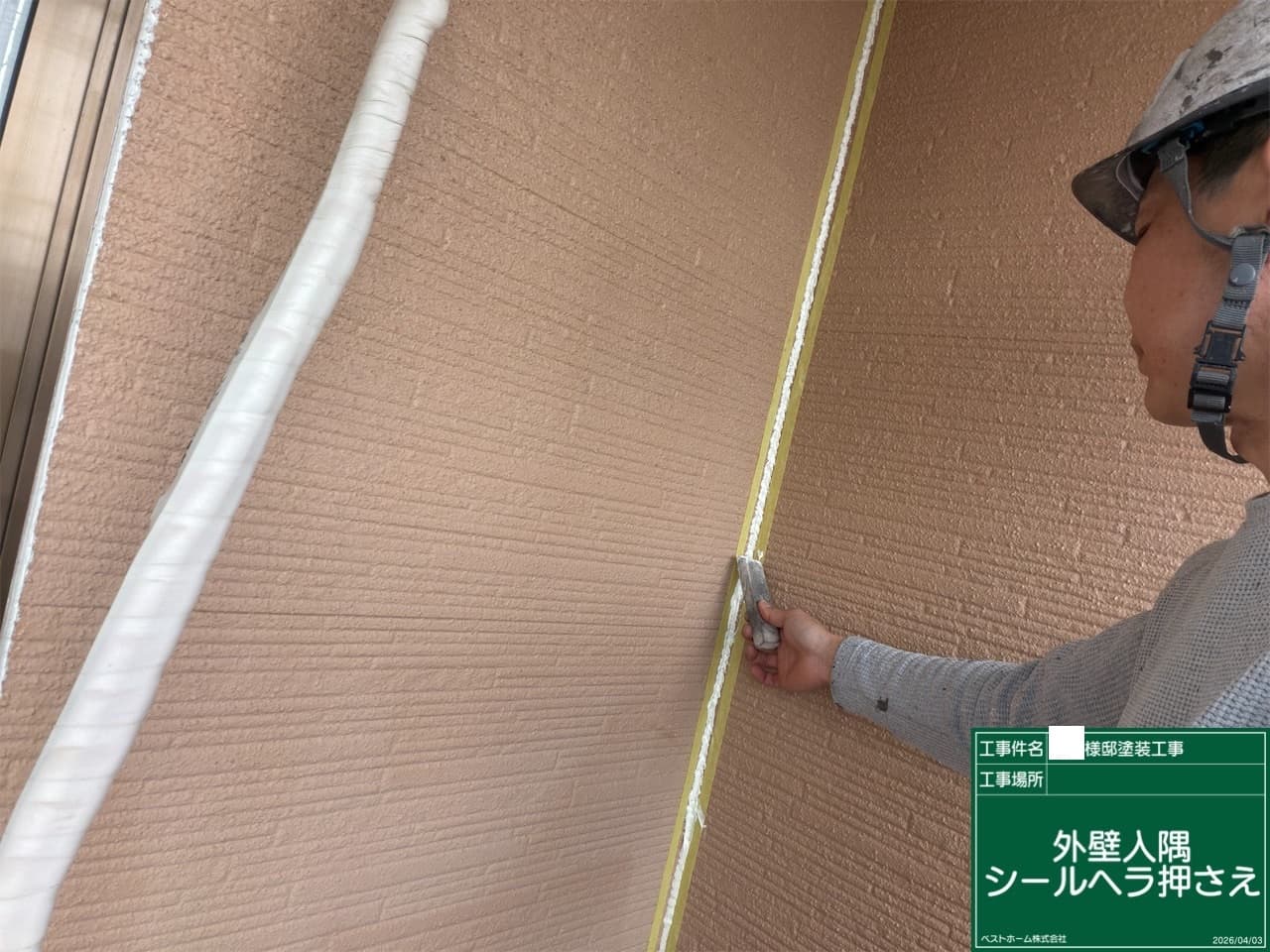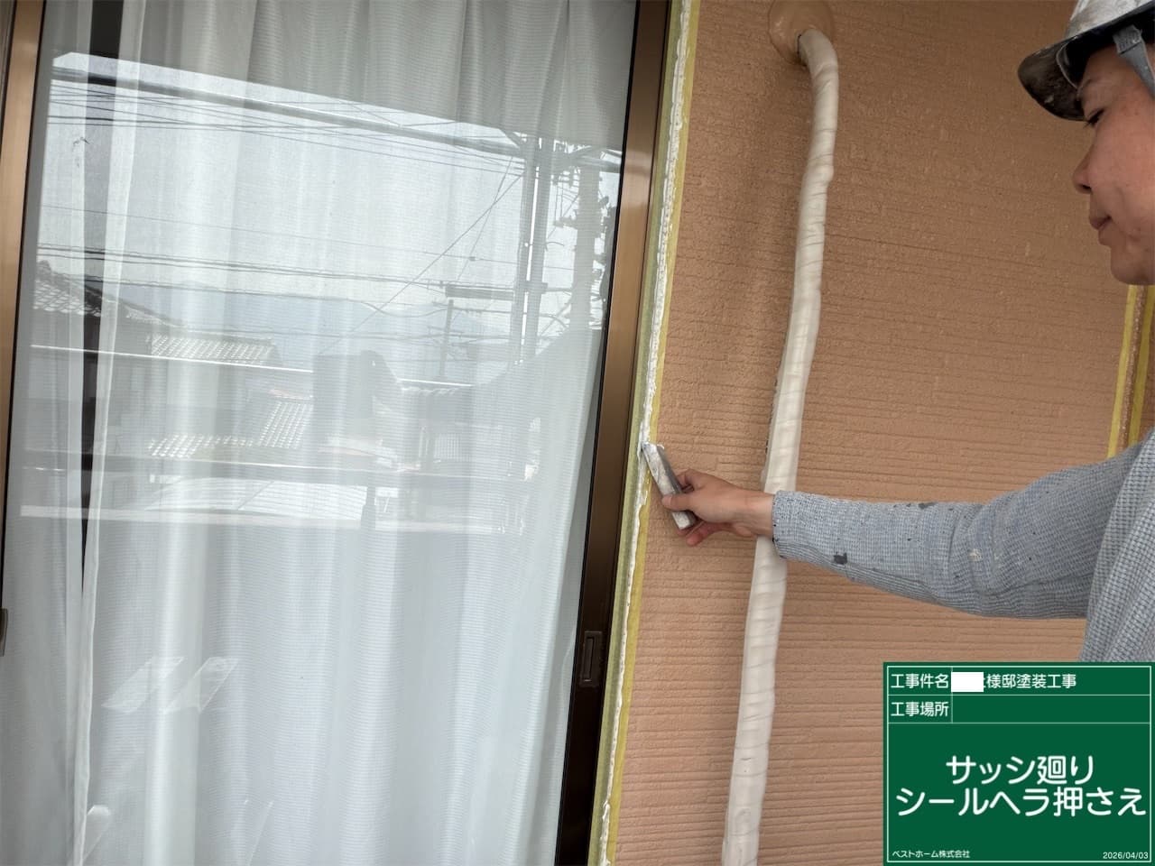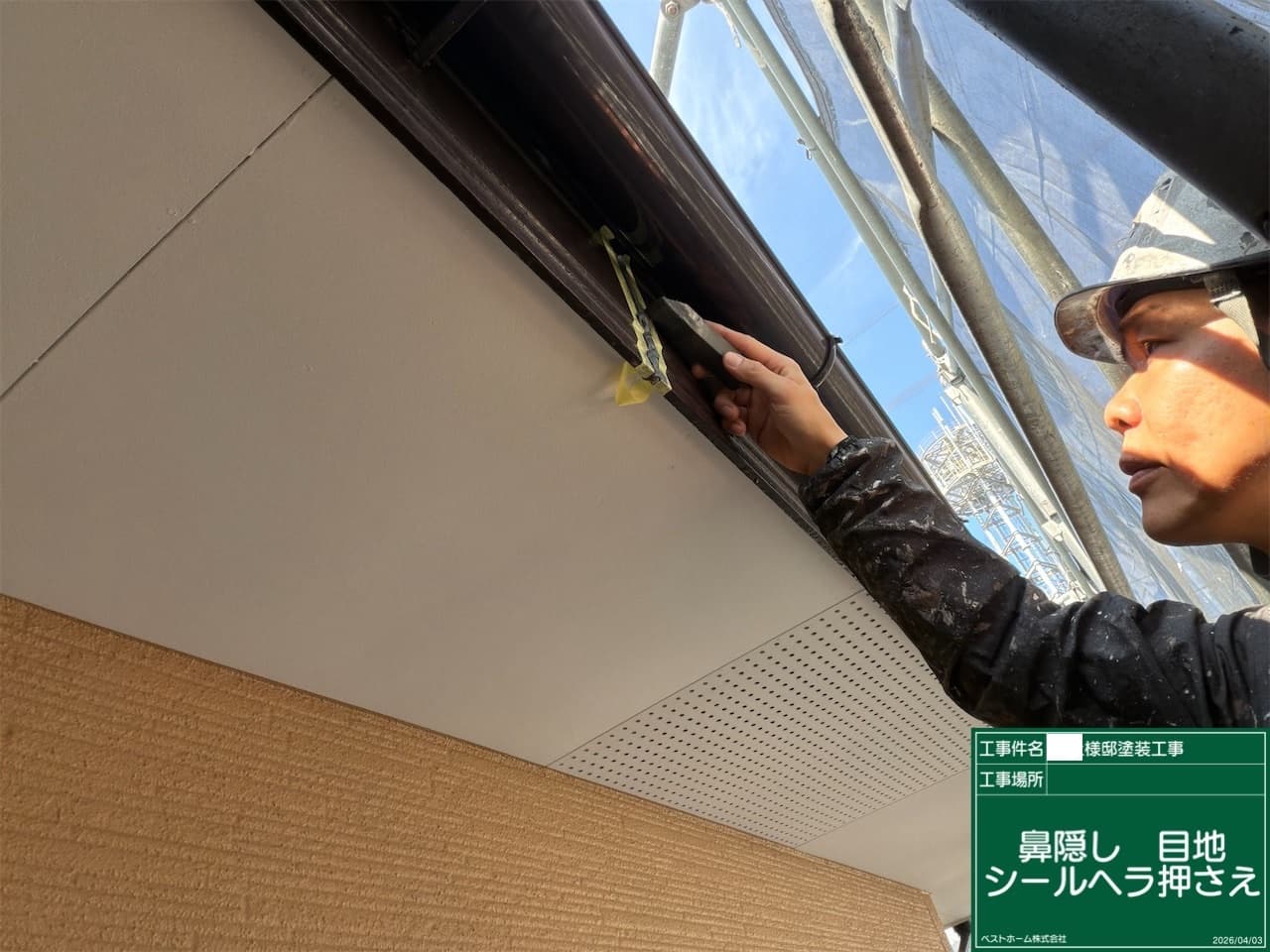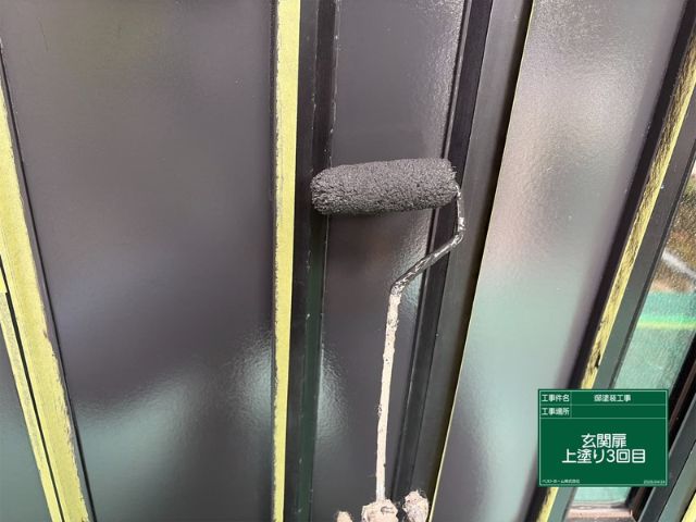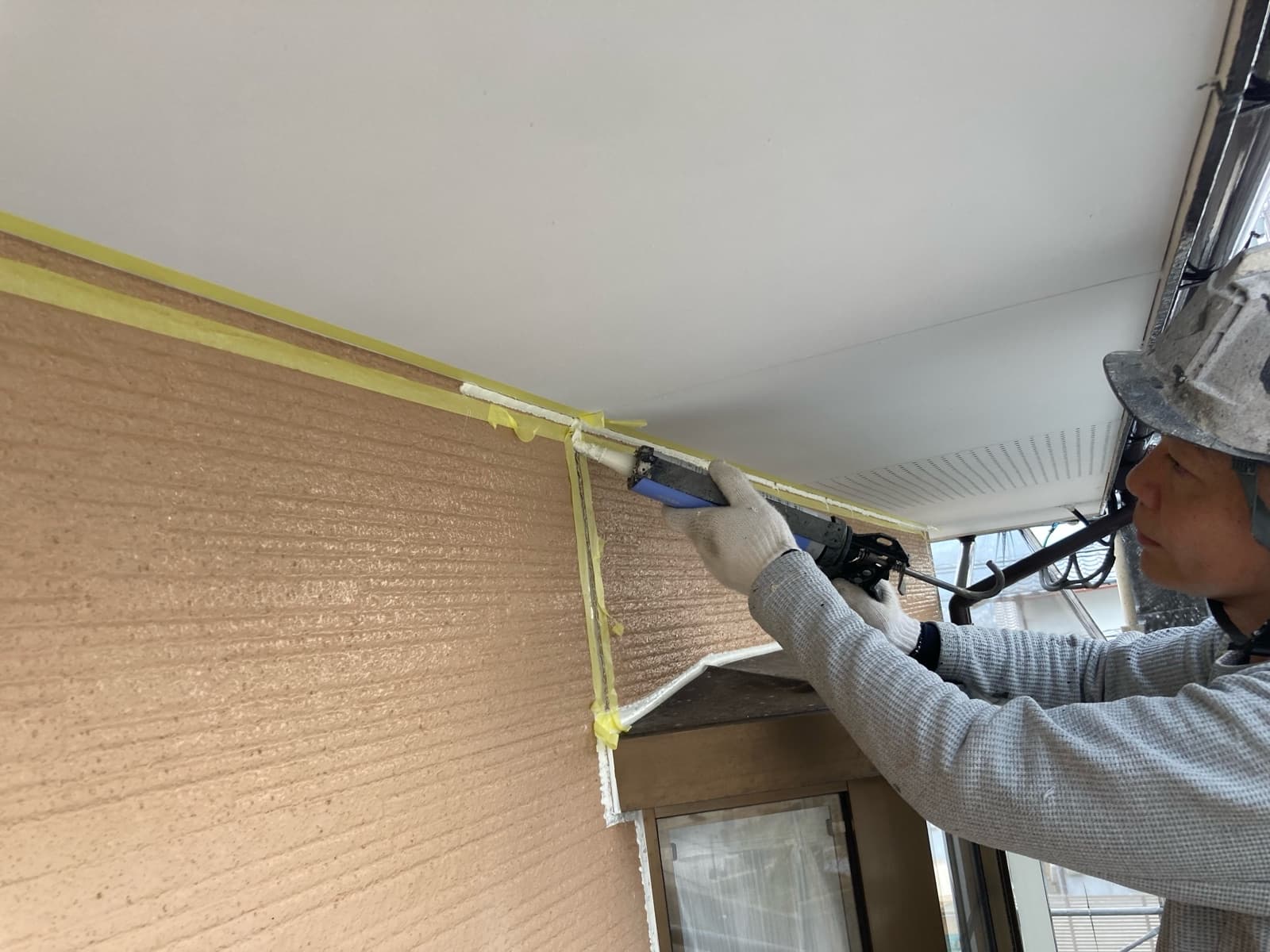 本日は付帯部塗装、ベランダ床塗装、下屋根上塗り2回目をさせて頂いております。