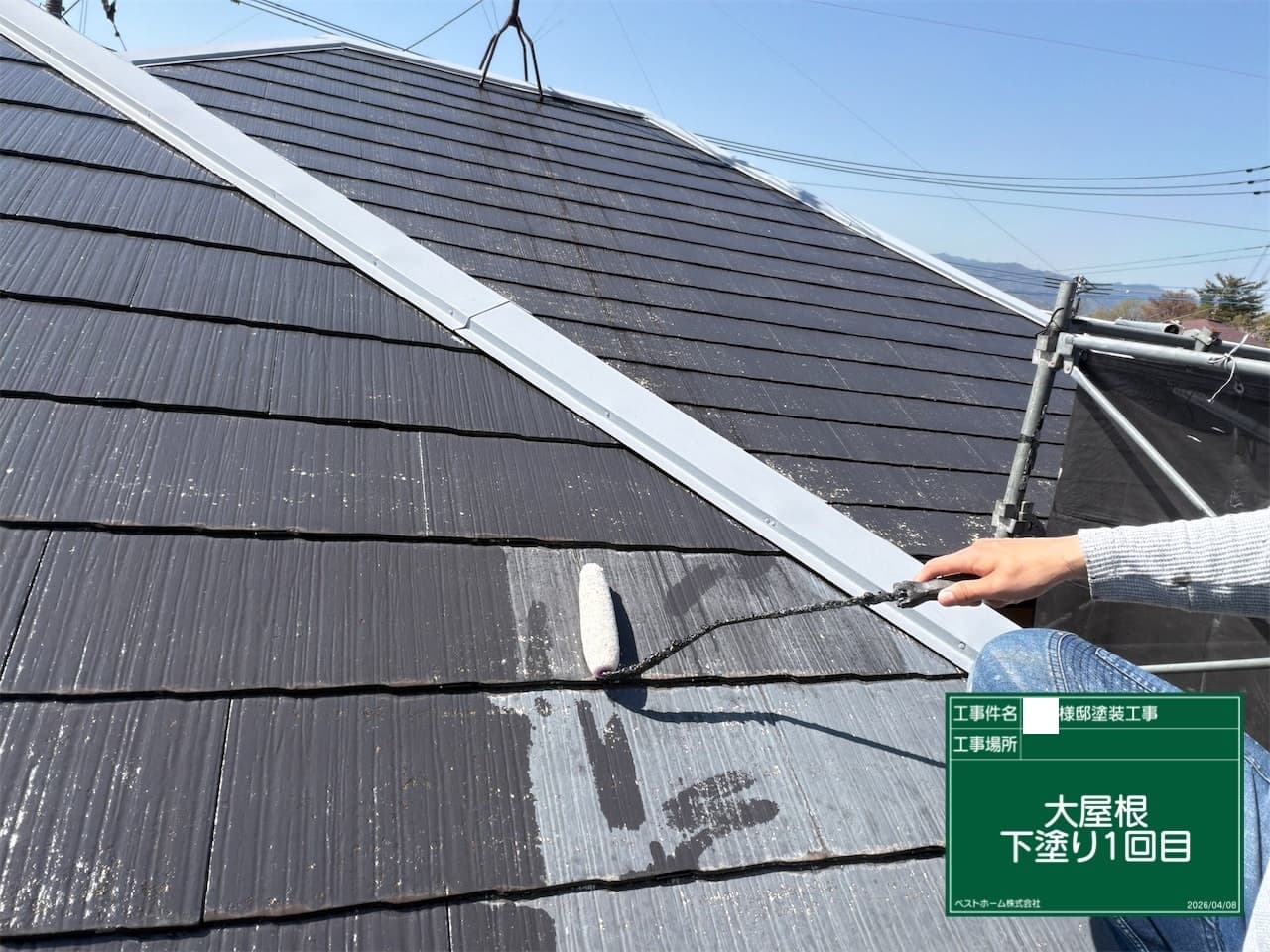 本日は大屋根上塗り1回目、外壁下塗り2回目、中間検査をさせて頂いております。