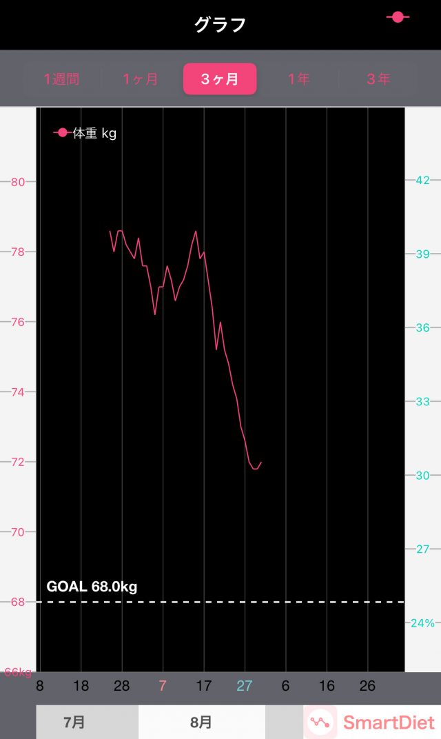 ひとまずの目標の10㎏減の68㎏まで、焦らずコツコツと進めてまいります!