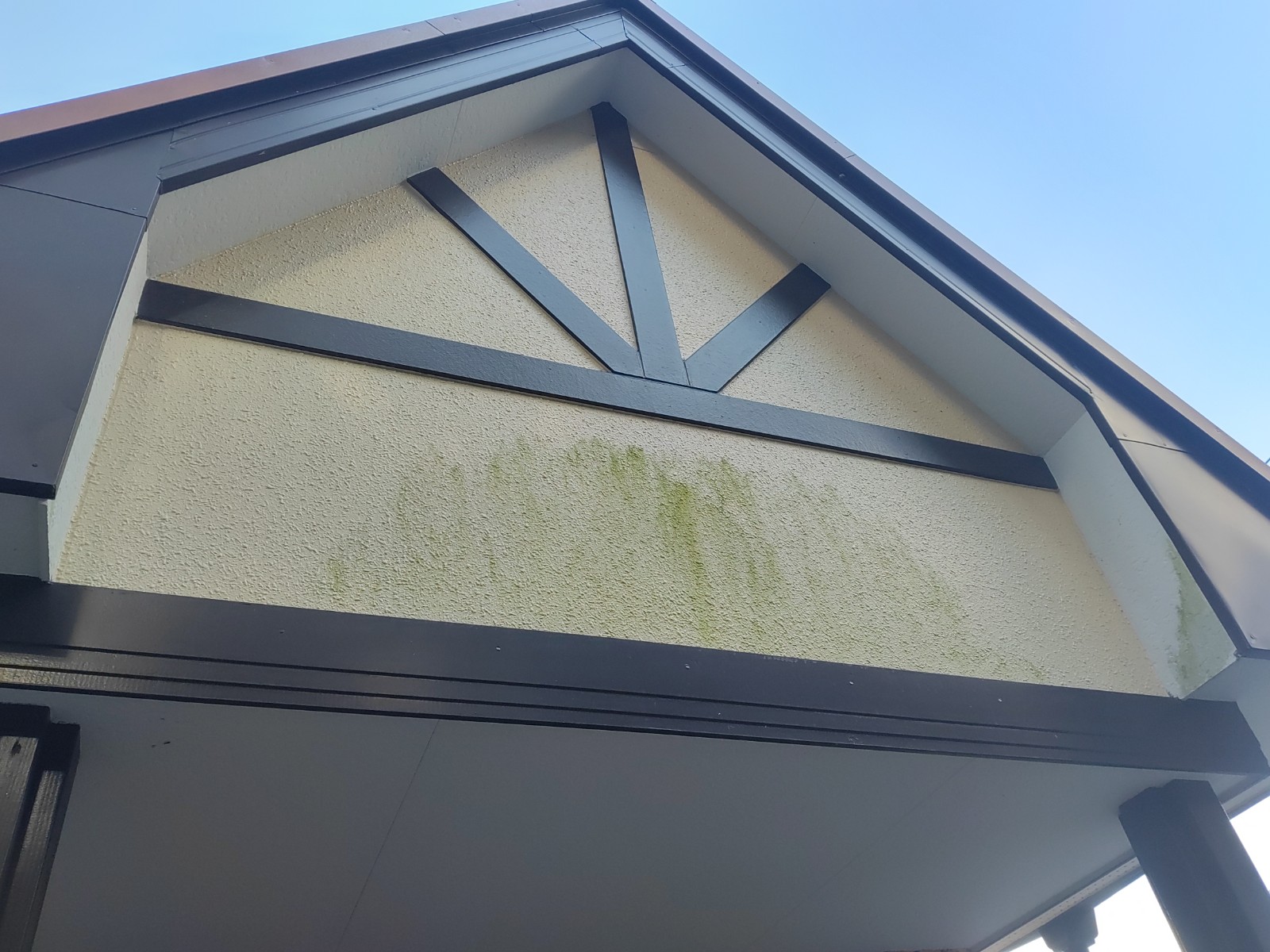 外壁面にカビが発生しております。周辺に木が多い為、どうしても生えてきてしまいますが、塗膜は活きてますので清掃すれば取れる状態ではあります。
