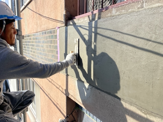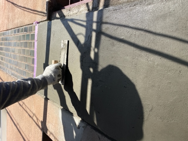 本日は、モルタル塗りの二層目の施工をさせて頂いております。