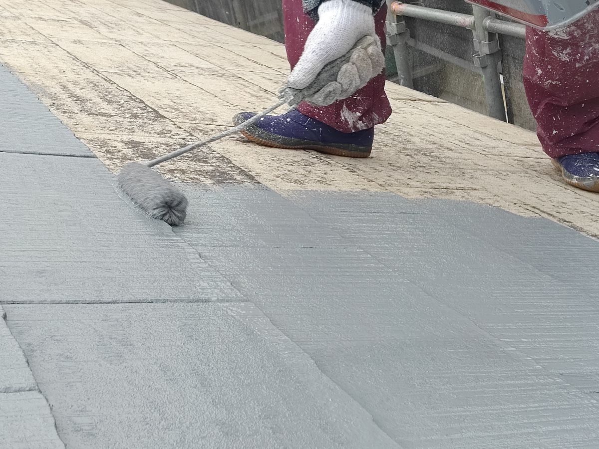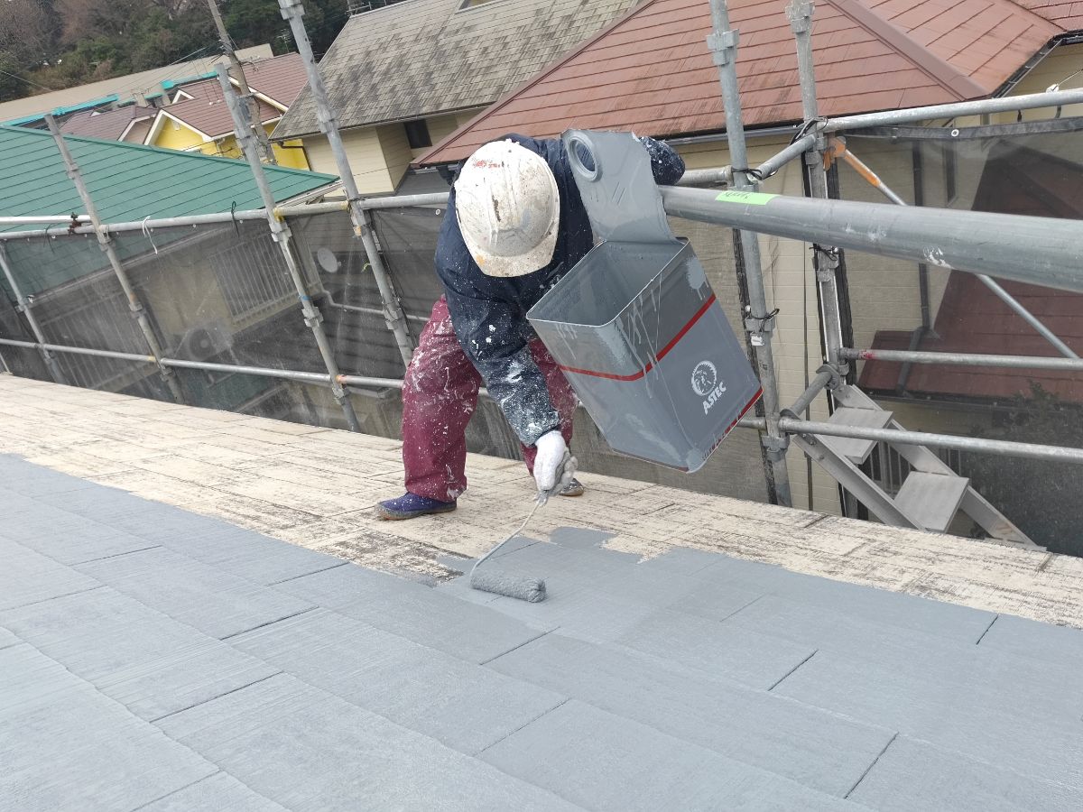 本日は、外壁下塗り2回目、屋根塗装 下塗り2回目、中間検査、軒天塗装をさせて頂いております。