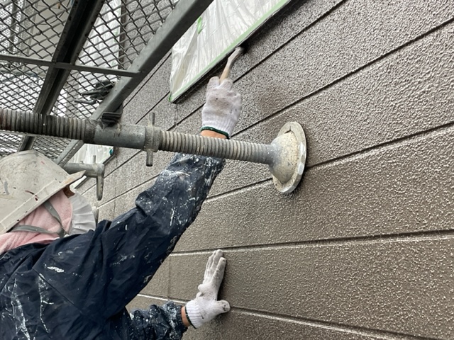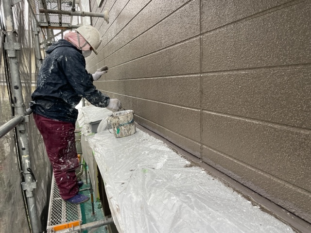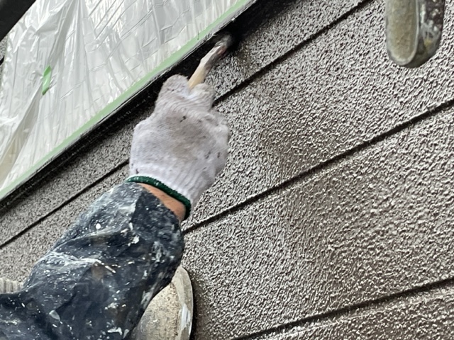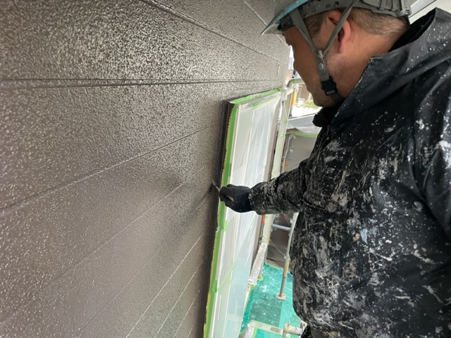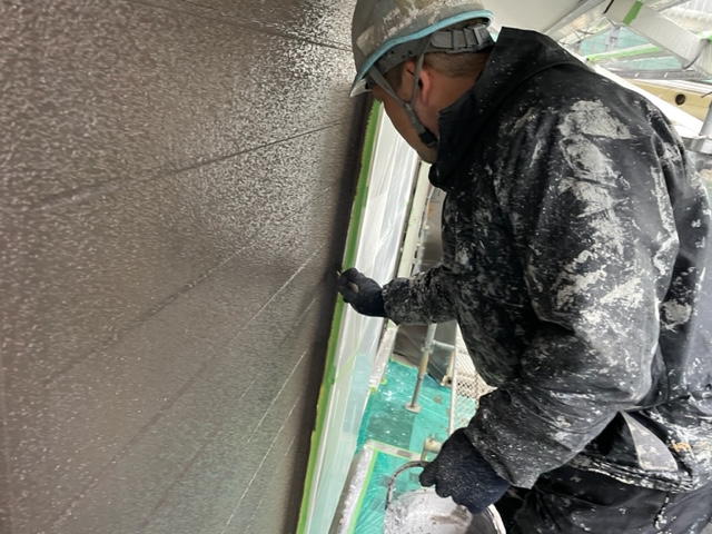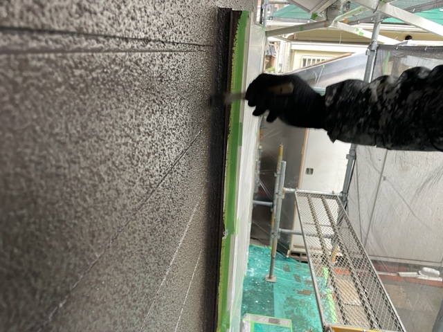 本日は外壁上塗り1回目、軒天塗装を行っております!