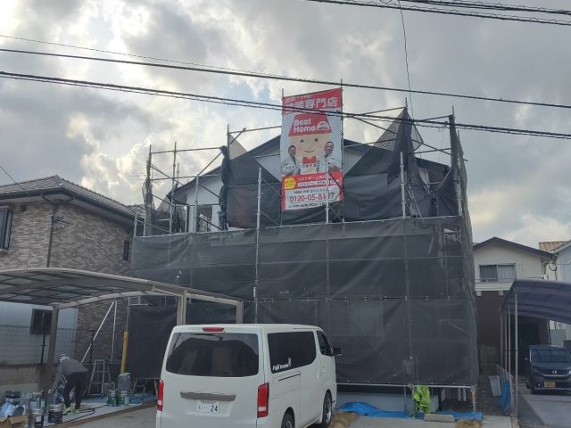 本日は、付帯塗装、基礎塗装、ベランダ床塗装、足場解体前検査(一部を除く)をさせて頂いております!