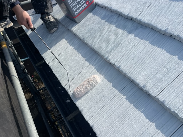屋根の下塗りの2回目をたっぷりと塗布させて頂いております!