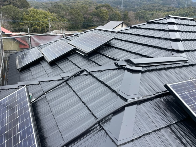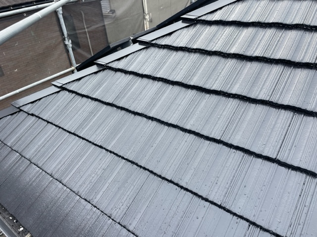 昨日のお屋根上塗り1回目後の様子です新しくお色が入ってまいりました!