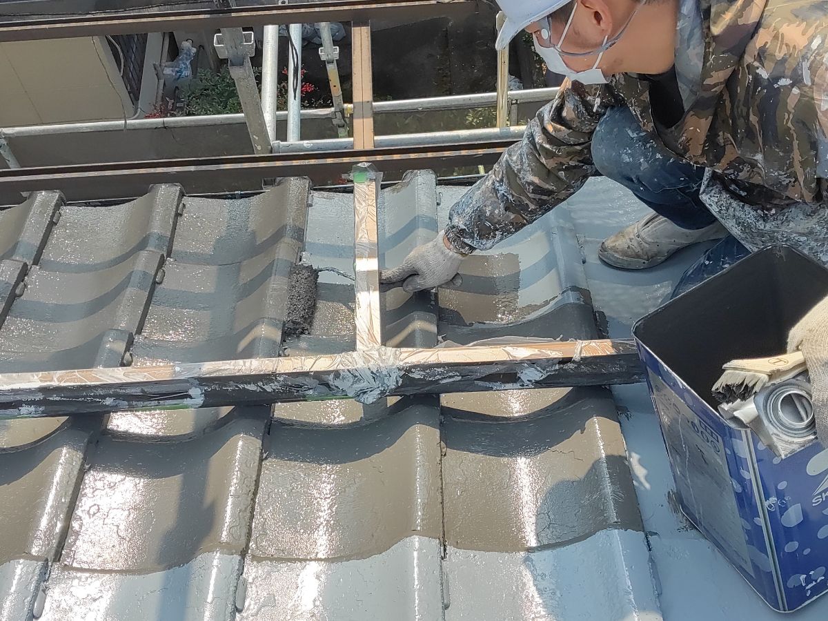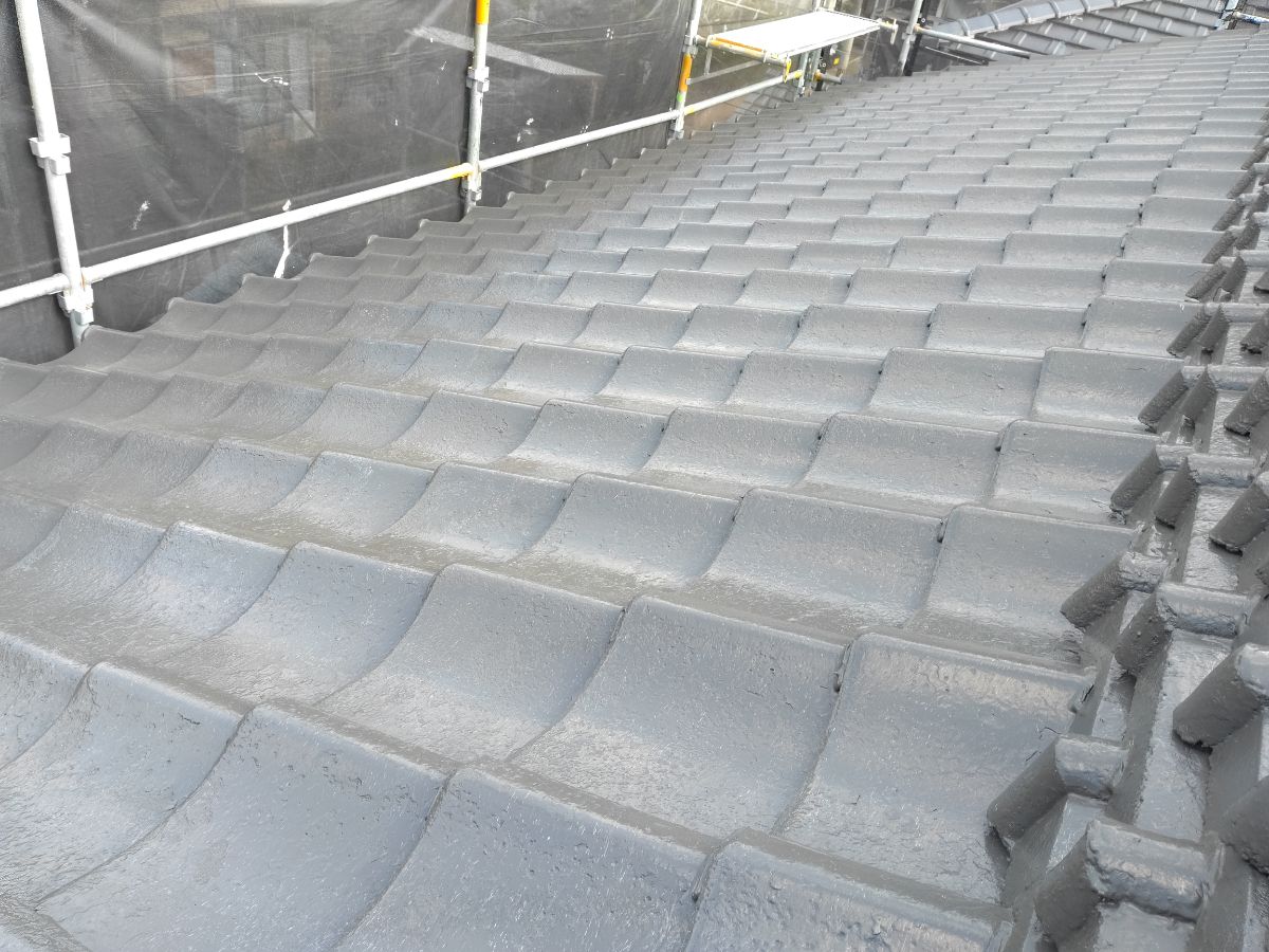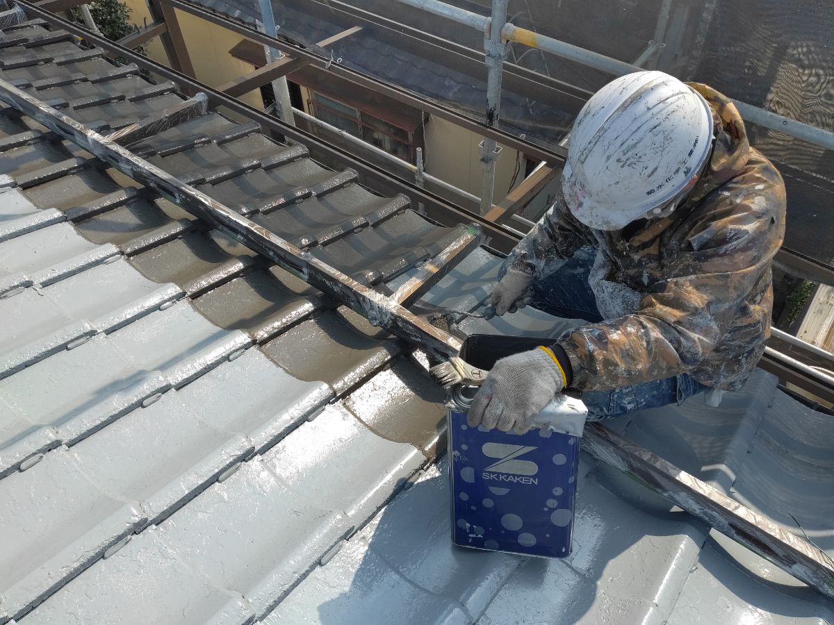 本日は、屋根塗装 上塗り1回目を行っております!