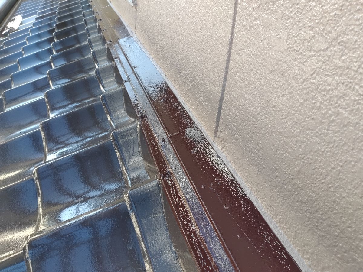 本日は付帯塗装、屋根上塗り1回目(続き)をさせて頂いております!