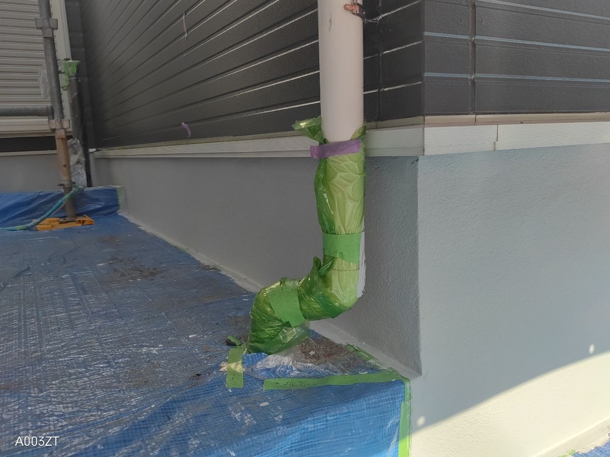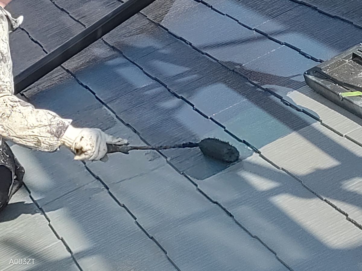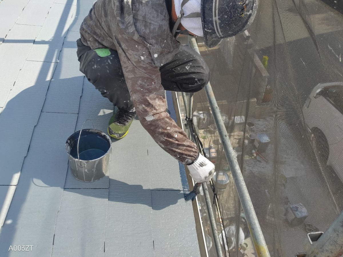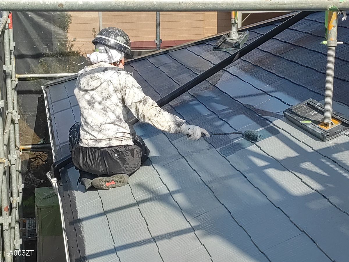 本日は、下屋根の上塗り1回目、基礎塗装などをさせて頂いております!。