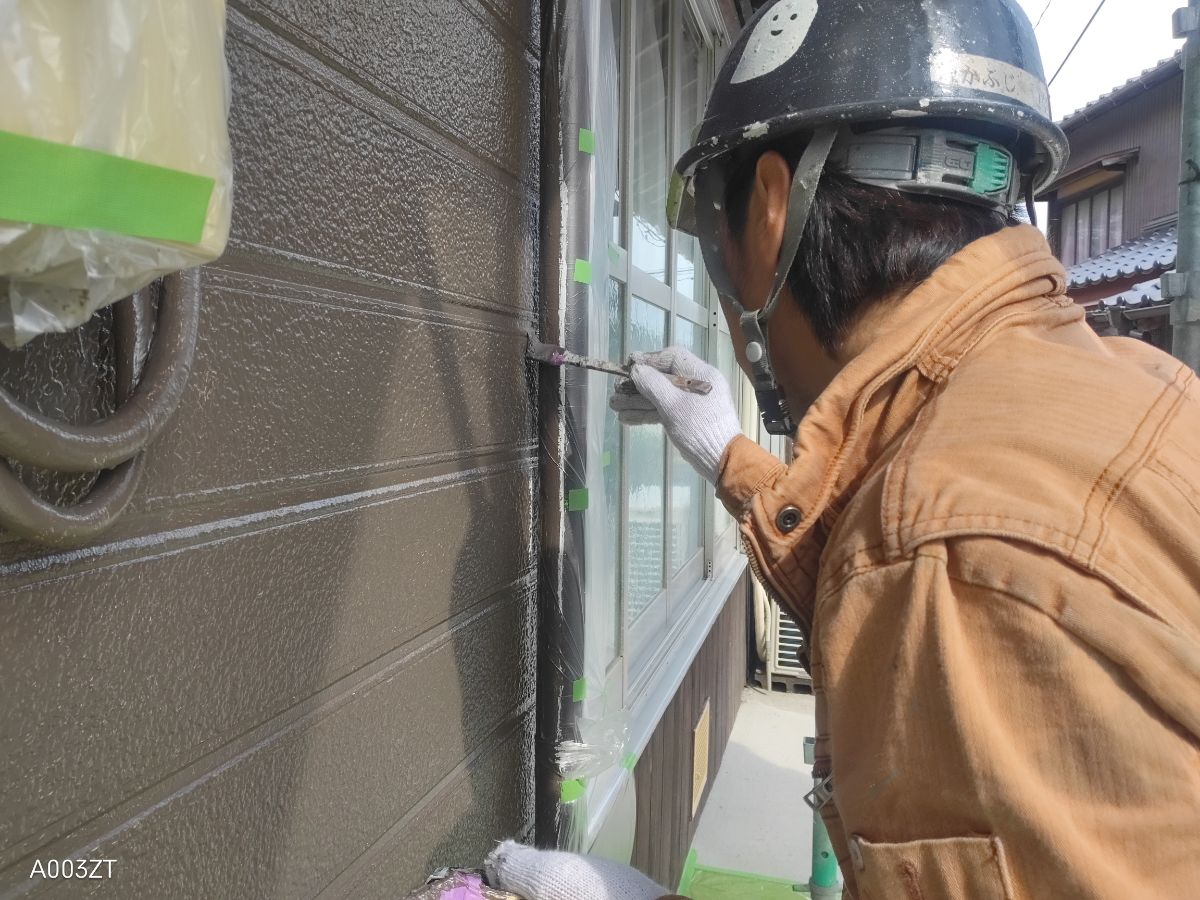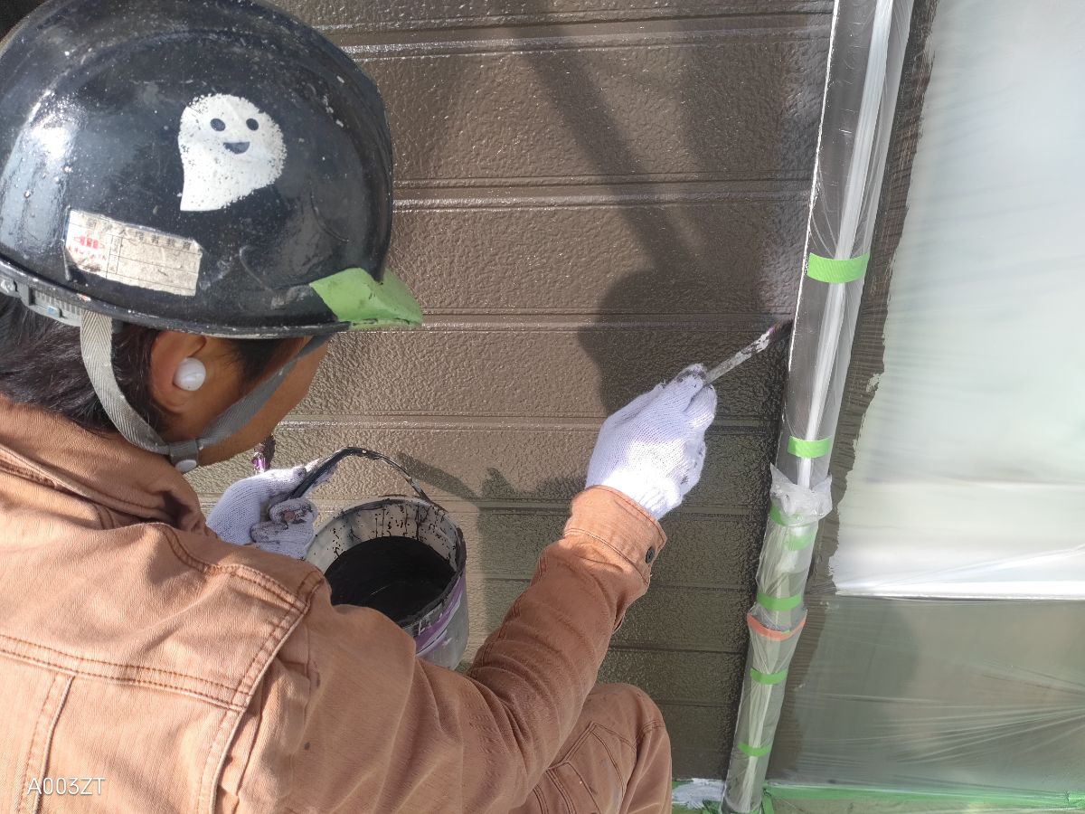 本日は、外壁上塗り1回目(刷毛取り)をさせて頂いております。